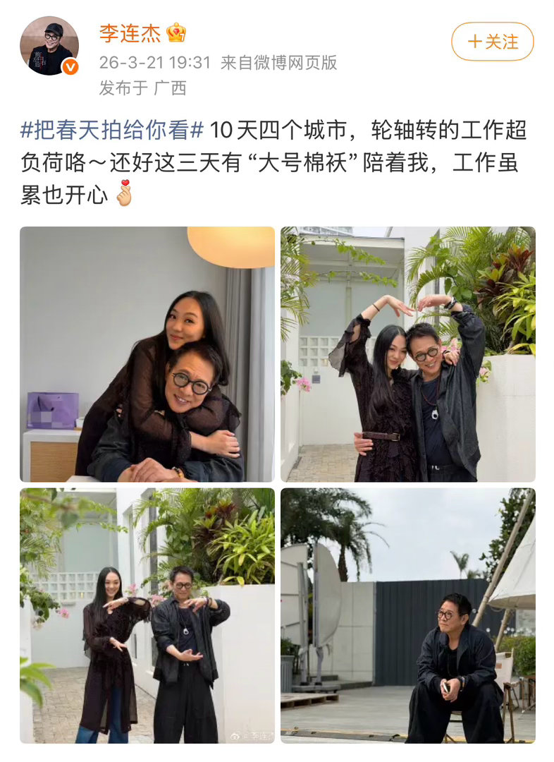 李连杰晒与大女儿合照 晒出与大女儿的合照,表示有女儿陪伴工作虽累也开心,亲昵称呼