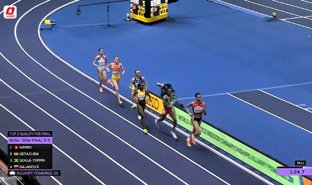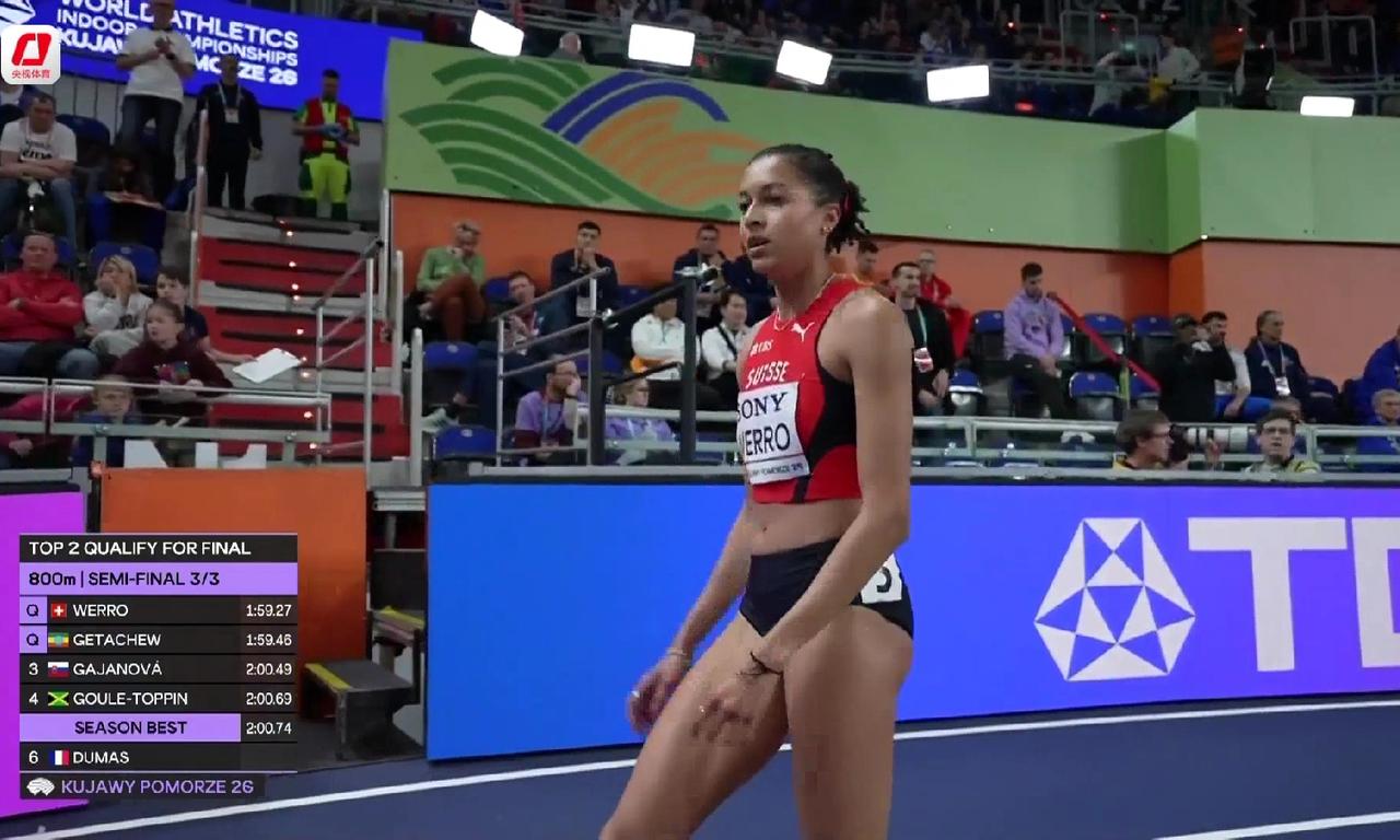 从今天2026室内世锦赛女子800米的半决赛来看,奥运冠军兼室内世界纪录保持者英国选手霍奇金森和美国选手威利均打开1分59秒,获得前两名晋级决赛。 展望决赛,霍奇金森获得冠军是大概率事件,她2月19日在法国创造了1分54秒87的今年世界领先成绩,而威利今天创造的1分58秒75的个人PB也是今年的世界第六好成绩。人高马大的瑞士姑娘韦罗以1分59秒27名列第三晋级决赛,作为半决赛第三组的头名,今天明显隐藏了实力,韦罗可是今年1分57秒27世界第二好成绩的获得者,将是明日决赛奖牌的有力争夺者。