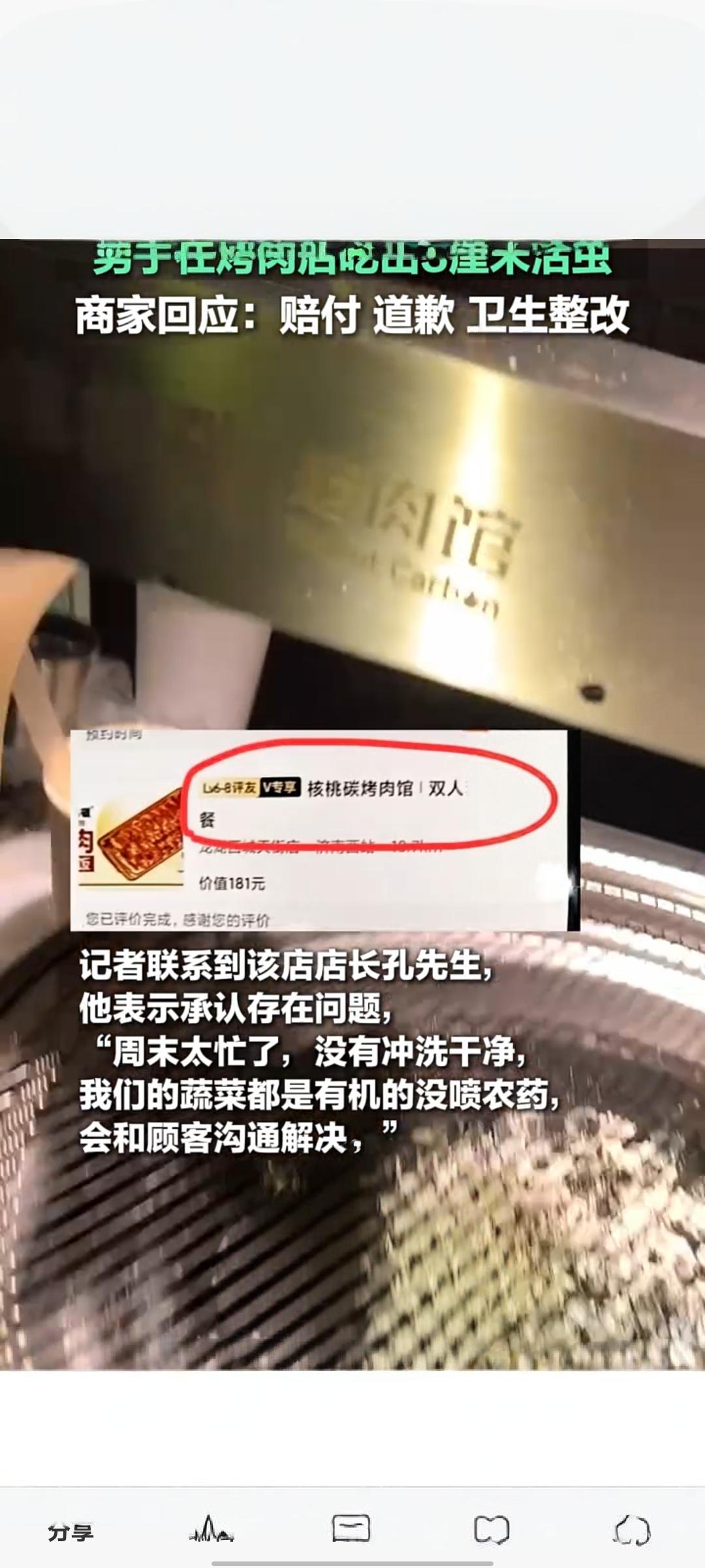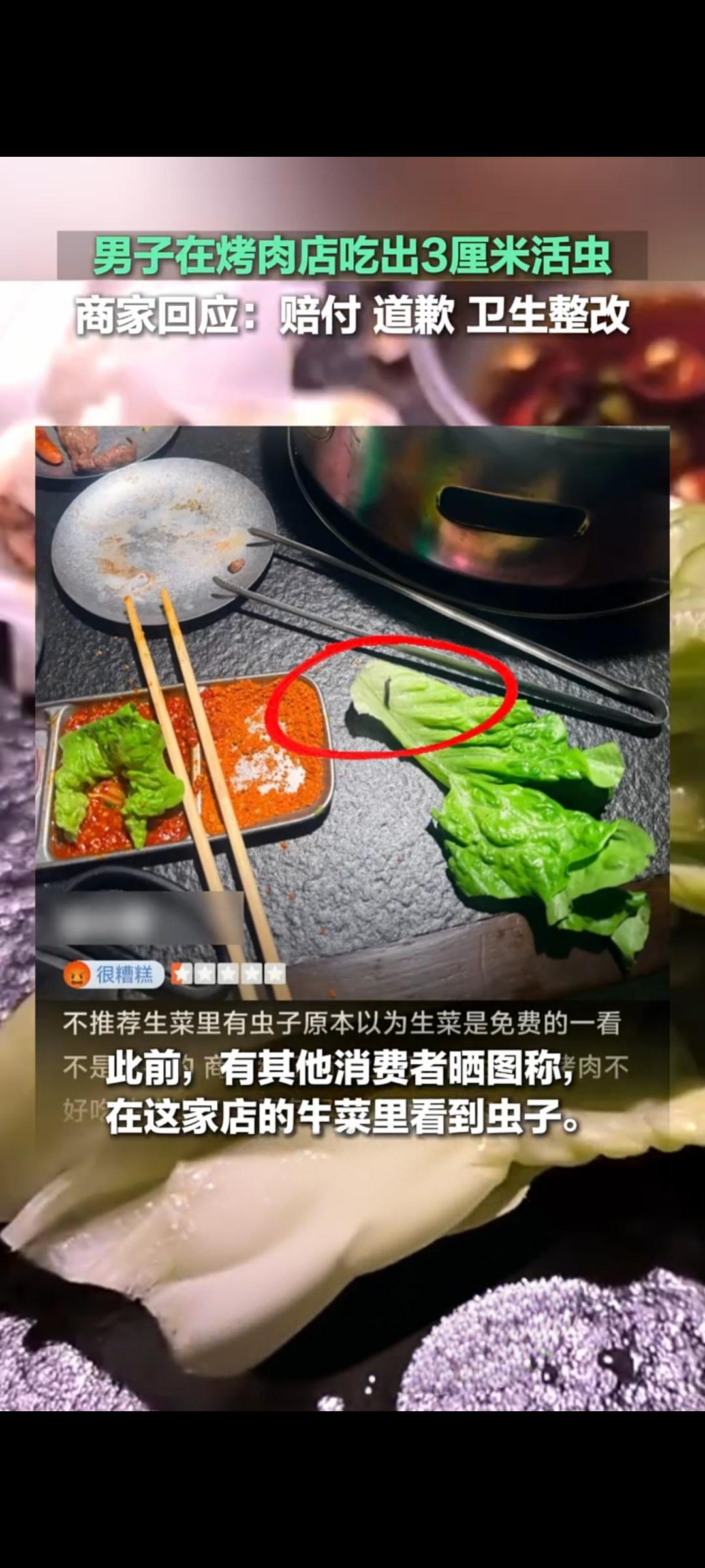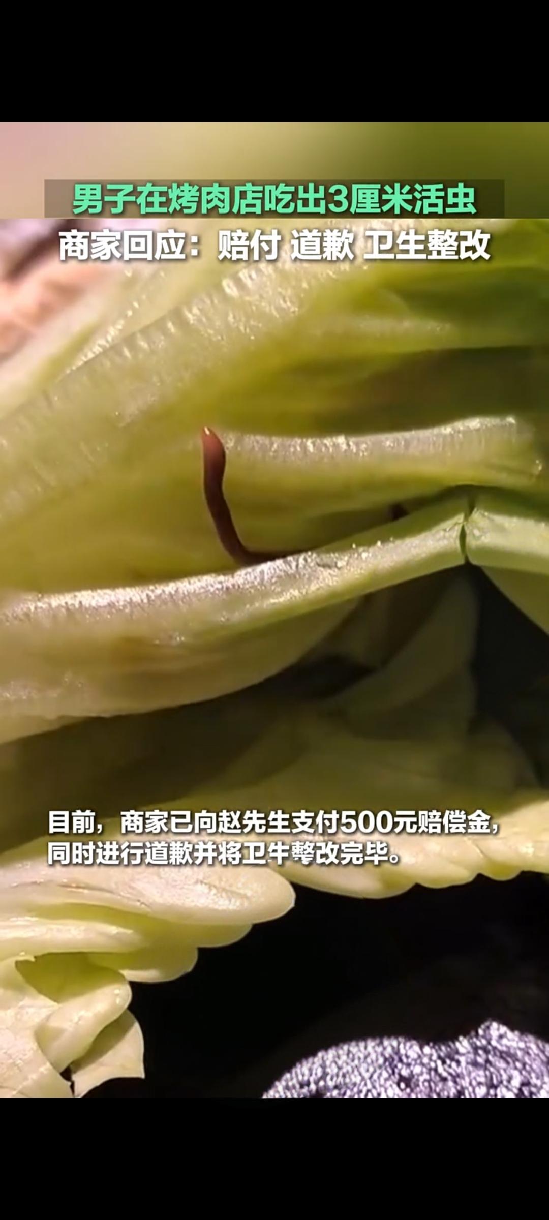 烤肉店生菜现3厘米活虫 商家致歉赔付并整改卫生 近日,有消费者反映在一家烤肉店就餐时,从生菜中吃出一条3厘米长的活虫,相关情况经齐鲁频道发布后引发关注,相关视频在快手平台的播放量已达1.4万次。据了解,该消费者就餐时准备用生菜包肉,意外发现菜叶上有蠕动的活虫,当即向店家反映了问题。 值得注意的是,此次并非该店首次出现类似问题,此前已有其他消费者反馈,在该店的生菜中发现过虫子。事件曝光后,涉事商家迅速作出回应,针对菜品中出现活虫的问题,向消费者表达歉意,同时已完成赔付工作,并表示将立即开展门店卫生全面整改,严把食材清洗和加工环节的卫生关。 此事在网络上也引发网友热议,有网友认为虫子或因蔬菜放置不当滋生,也有网友称菜品未清洗干净是主要原因,还有部分网友觉得此类情况较为常见,无需过度较真。目前,商家的卫生整改工作正在推进中,消费者也对处理结果表示认可,该事件也为餐饮行业敲响食品安全警钟,提醒商家重视食材处理与卫生管理。 食物上的小虫子 餐饮吃出来虫子 食材管理及卫生管理
