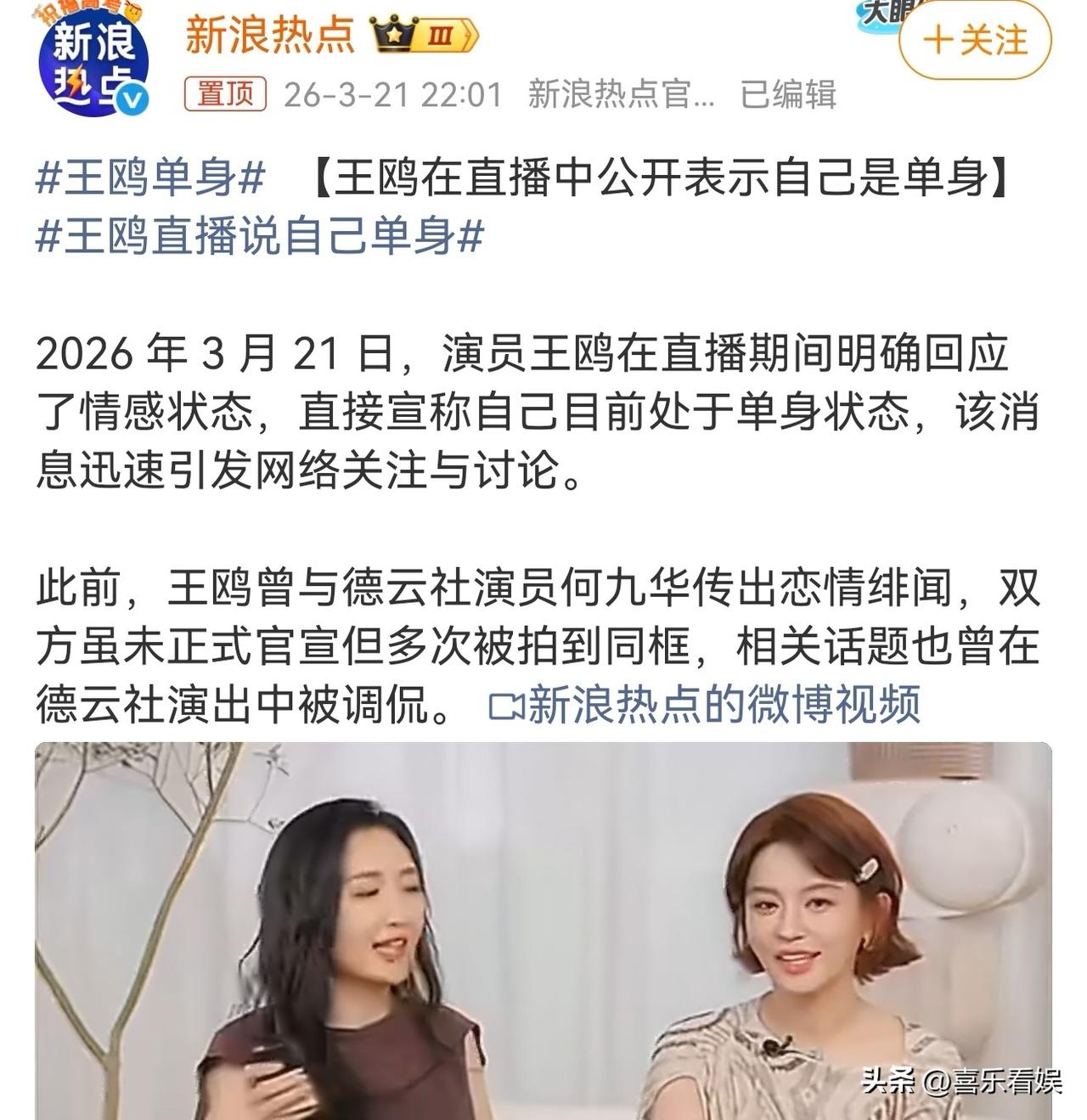 王鸥,说自己一直是单身 3月21日晚,王鸥在直播里直接摊牌了,称自己一直是单身状态,还说单身特别自在从容,不用天天惦记谁、操心谁。 这话一出来,网友直接炸锅了,好多人都懵了:“之前不是跟何九华传得沸沸扬扬吗?还被拍到同框,怎么现在又说一直单身?” 还有人说:“我印象里都传她领证生子了,这就分了?还是从头到尾都是误会?” 众所周知,王鸥和何九华的绯闻传了好久,虽然俩人从来没正式官宣,但各种被拍到同居的画面流出后,都让大家默认他俩在一起了。 结果王鸥这现在一句“一直是单身”,可以说是把之前的传闻全推翻了,也难怪网友们集体“记忆错乱”。 毕竟谁能想到传了这么久的恋情,最后是这么个结局。 以前看她演的角色,总觉得她是那种清醒又独立的大女主,这次直播里说单身的从容感,倒也挺符合她的人设。 不管之前的绯闻是真是假,现在她自己站出来把话说透,也算给这段时间的猜测画了个句号。 对此,你们怎么看?