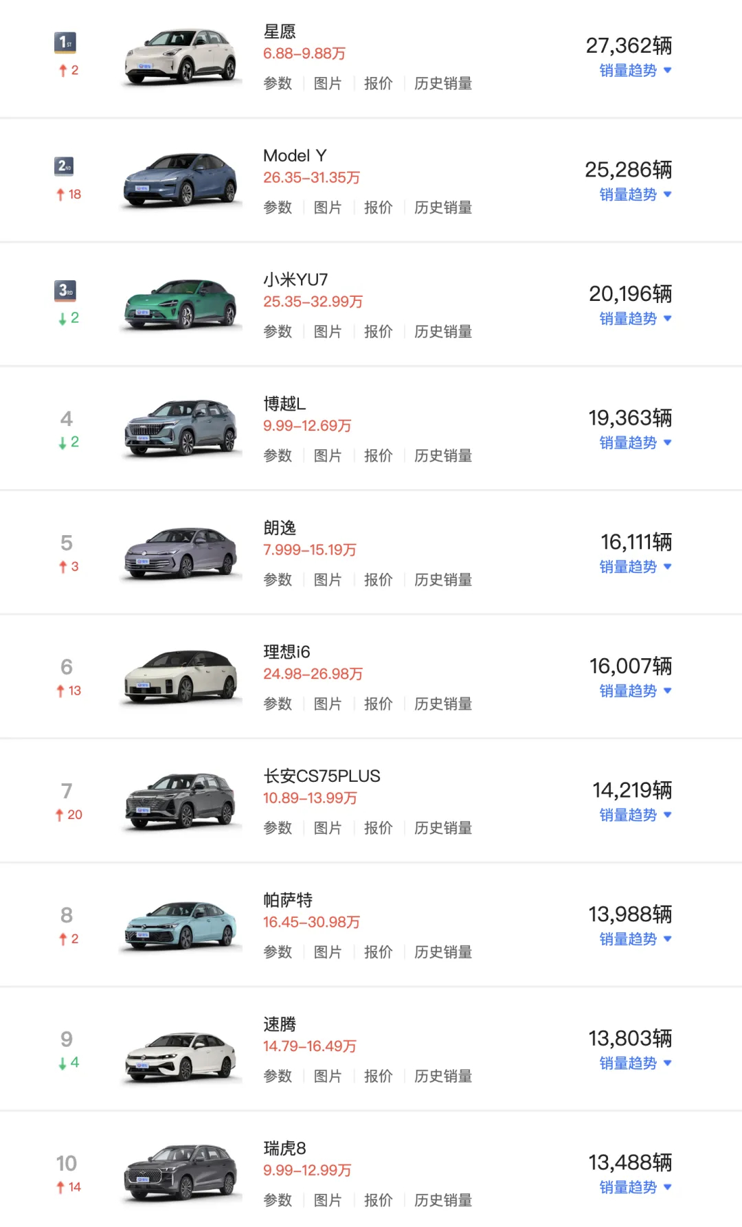 根据乘联分会公布的最新汽车销量榜单显示,2月共有三款车型销量超过2万辆,分别是吉利星愿、特斯拉Model Y和小米YU7,其中吉利星愿以27362辆拿下第一,特斯拉Model Y和小米YU7分别为25286辆、20196辆。满谈汽车