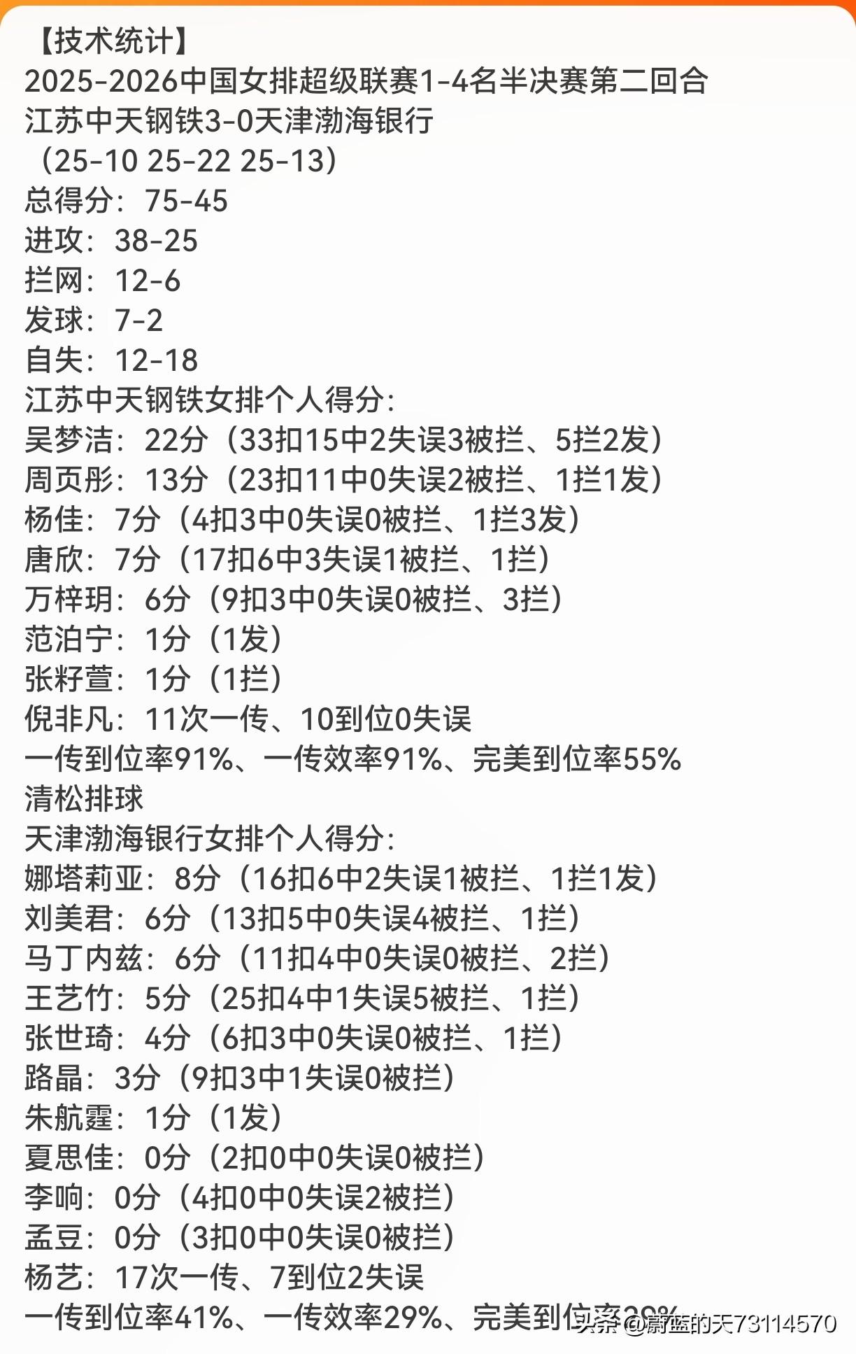 [半决赛第二回合:江苏女排完胜天津女排] 江苏女排在联赛1-4名半决赛第二回合比赛中,以25-10,25-22,25-13完胜天津女排, 金局之战中又以18-16胜出,将天津女排淘汰出局,与上海女排会师决赛(同上赛季一样)。 一,本场比赛,从比分上看江苏女排是完胜, 4局球是全面压制!发扣拦防一传和多点攻全部打出来了,使得天津女排在第二回合三局中,无人得分上双,第一局仅得10分,第三局得13分,惨不忍睹,创下了天津女排单局得分的最低纪录。 二,从双方数据上来看是完胜: 三局总得分:75-45(赢30分) 进攻得分:38-25(赢13分) 拦网得分:12-6(胜6分) 发球得分:7-2(胜5分) 自失:12-18(少失6个) 边攻得分:43-22(其中扣球32-18) 副攻得分:13-10(其中拦网4-3) 三,吴梦洁是发扣拦防一传全面的强力攻手: 三局总得22分,全场得分王,5拦网得分,拦网王,2发得分为全场第二,共接了18次一传(本队最多),净得15分。 金局战中:8分(15扣7中0失误被拦,1拦)。 四,倪非凡是防守大将,表现绝对不凡。 11次一传,10到位0失误。一传到位率91%,一传效率91%,完美到位率55% 另外,倪非凡的防守预判卡位移速及垫调到位,无疑是目前最好的。 五,周页彤本场比赛打出来了,得13分,净得10分,有效地分担了吴梦洁的压力,是江苏女排获胜晋级的功臣之一。 点赞江苏女排,望再接再厉,砥砺奋进!加油[赞][赞][赞][点亮平安灯][点亮平安灯][点亮平安灯]