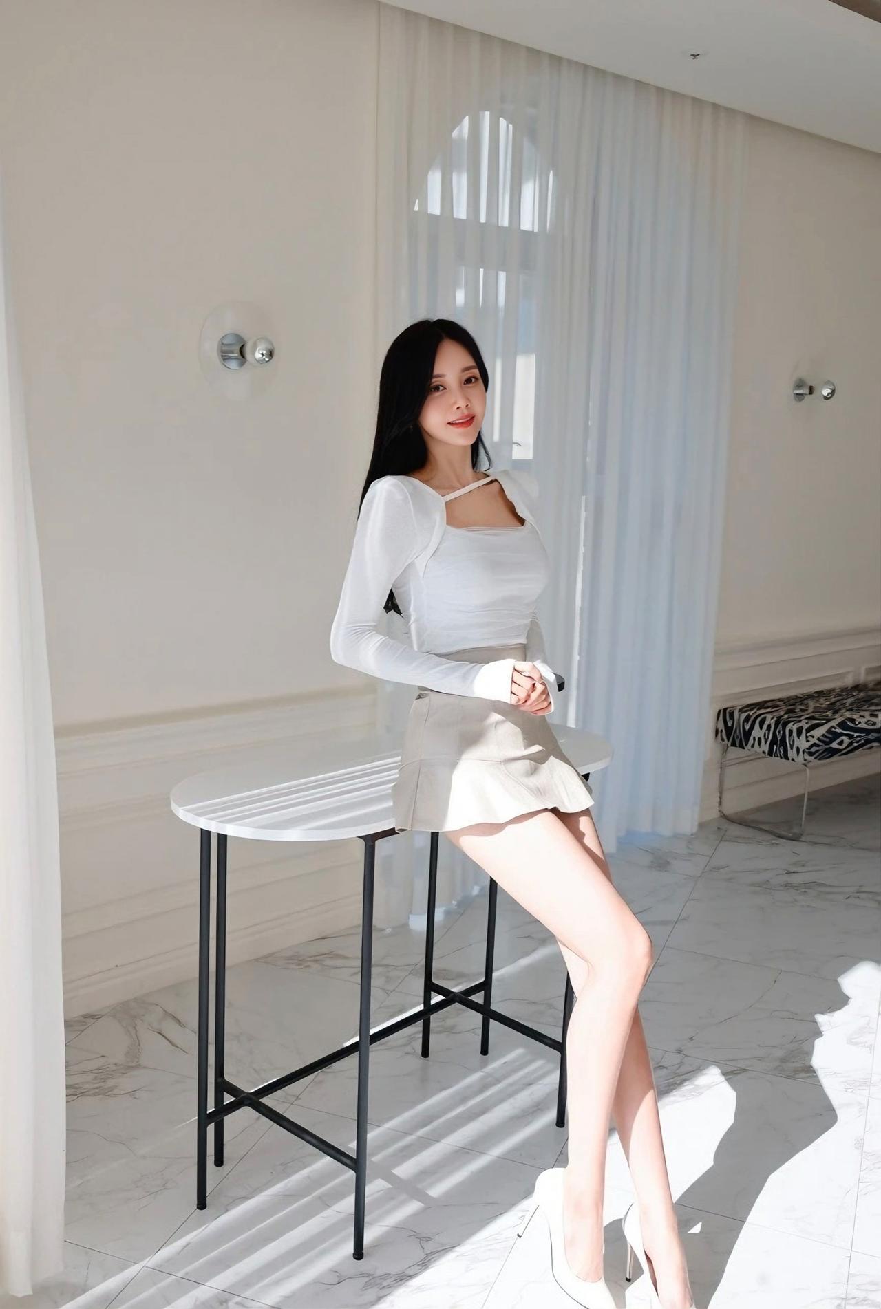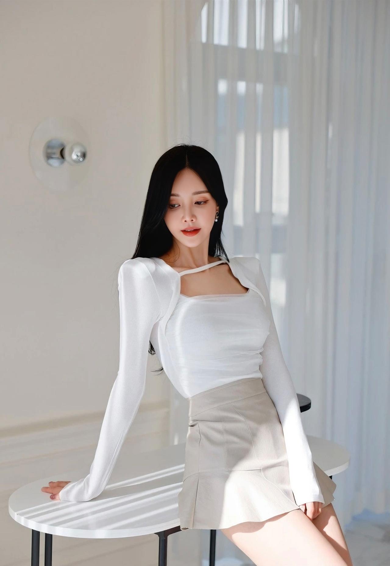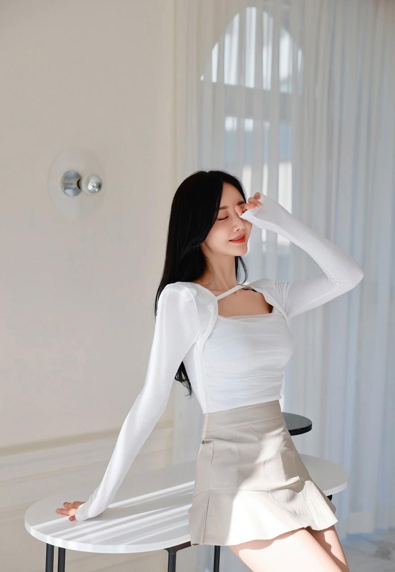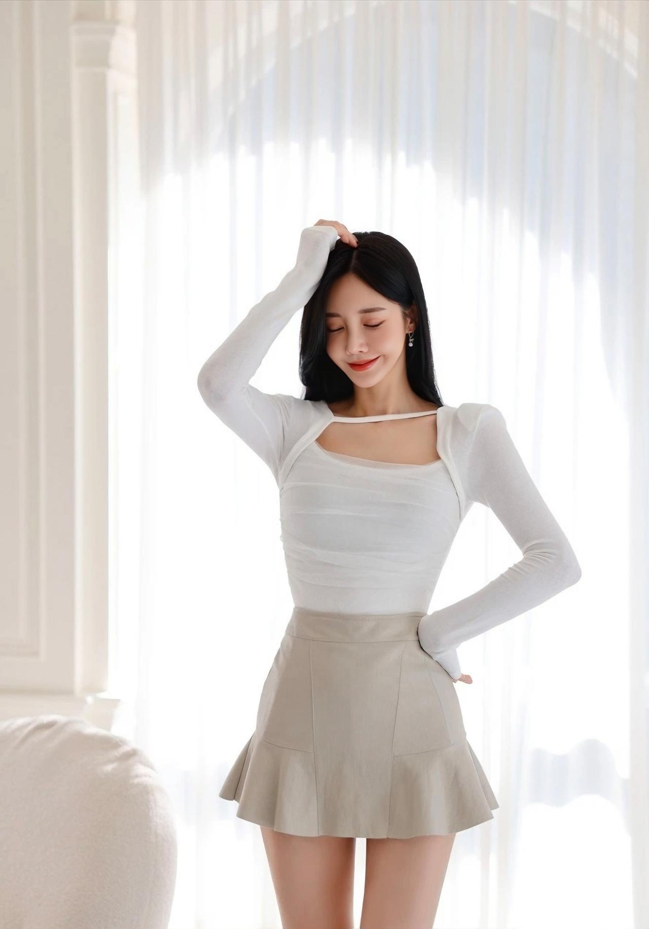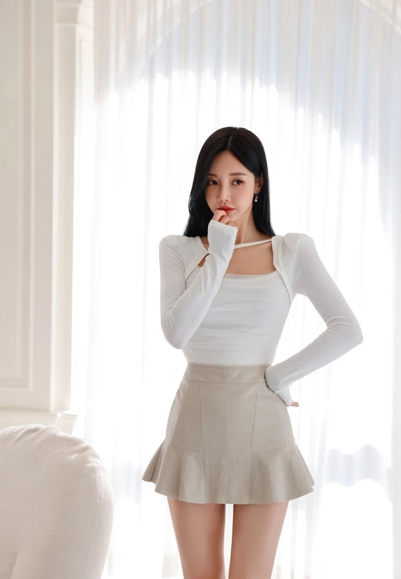 优雅气质穿搭,白色长袖上衣搭配米色短裙,尽显时尚与甜美。