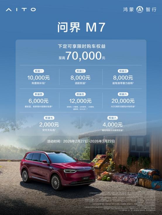 问界M7超省心,让春日自驾出游更轻松,限时权益更贴心 春天适合去更远一点的地方,看花海、逛古镇、走湖边公路,这时候一台省心的车很重要。问界M7升级全新增程系统,增程长续航版CLTC满油满电综合续航可达1690km,纯电续航327km,日常通勤和周末远行都更从容。整车风阻系数低至0.249,也进一步兼顾能耗表现。在安全方面同样值得信赖。近日,中汽中心C-NCAP公布最新测试结果:问界M7以优异成绩斩获超五星安全认证,综合得分率95.0%,为春季出游再添一份安心。面对景区停车、窄路会车这些常见场景,问界M7还拥有低至5.7m的转弯半径,掉头、挪车更轻松。再加上途灵平台带来的稳定驾乘质感,春季自驾出游会更舒服。 另外,全新问界M7夜紫新色也已正式亮相,以高级配色与细腻光影质感,让整车更具时尚格调,自驾出游时也更显品位。关键是2月27日-3月22日下定问界M7,至高可享70,000元购车权益,包含1万元购置税补贴、8000元选配权益、舒享包、ADS高阶功能包补贴等,贴心又超值。 问界M7官宣夜紫新色 问界M7新车色亮相