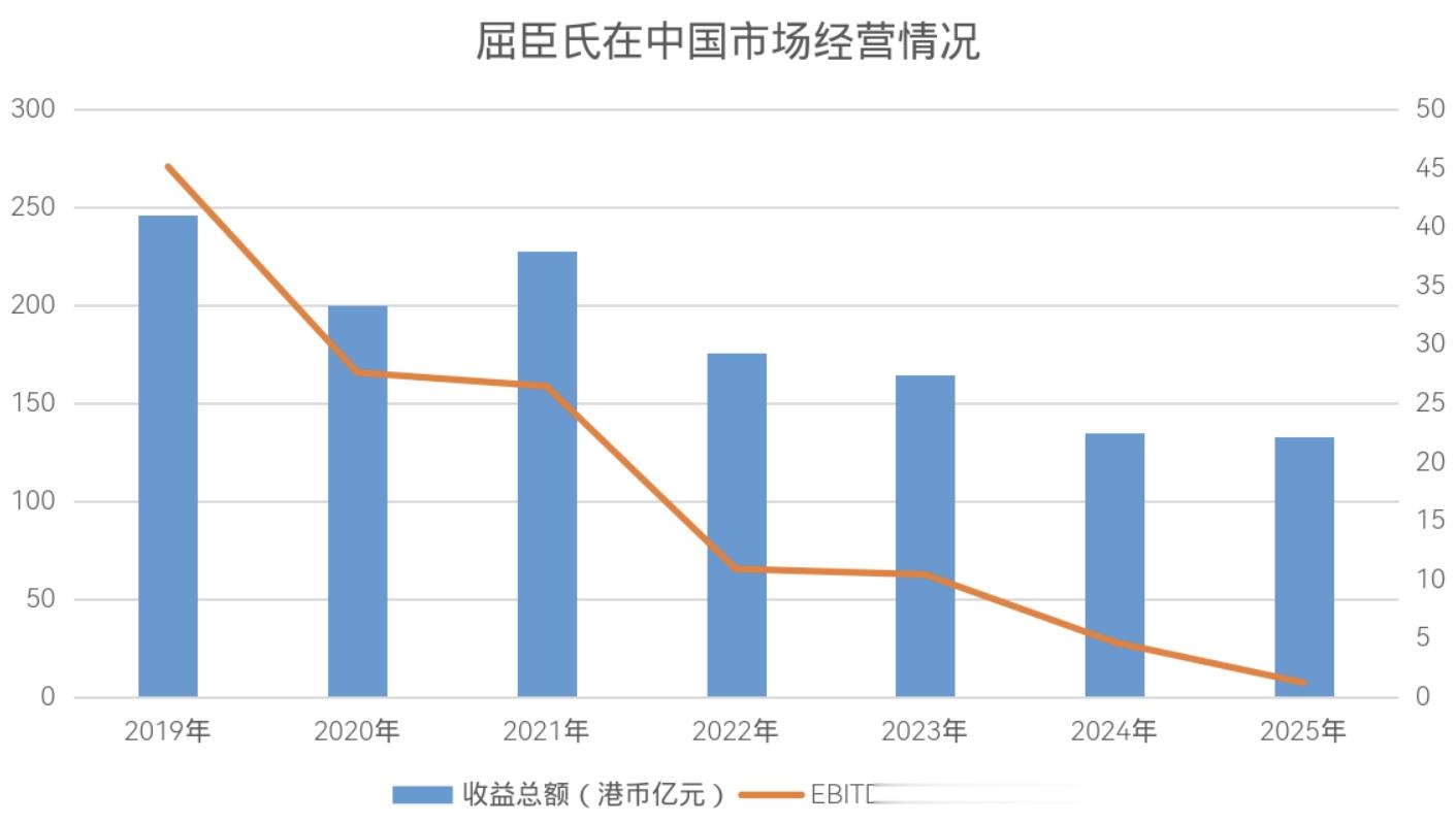 然而,中国市场却呈现疲软态势:营收132.65亿港元,同比下降1.8%;EBITDA仅1.22亿港元,同比骤降73.88%。作为唯一营收与盈利双降的市场,屈臣氏在中国正面临严峻挑战。