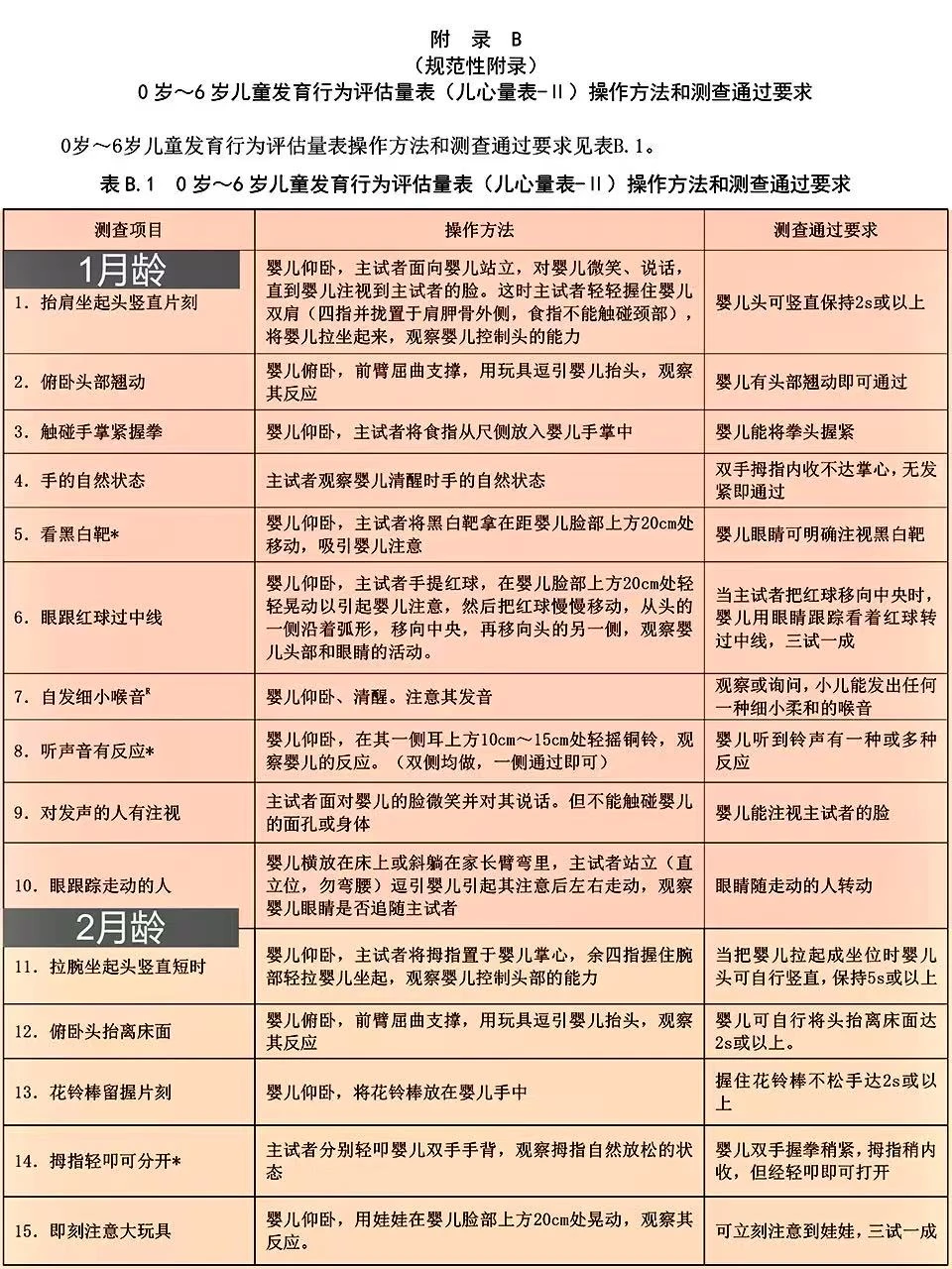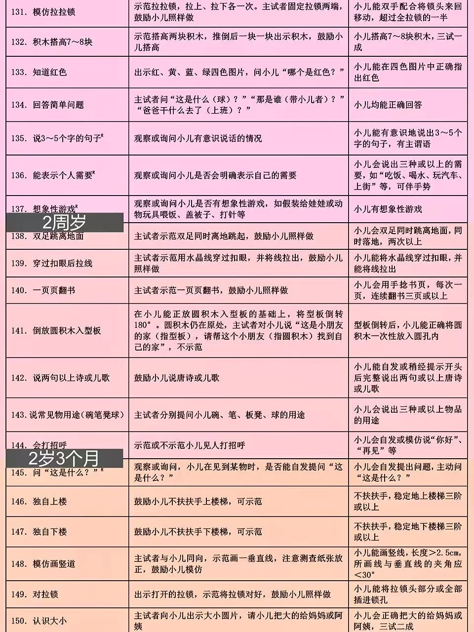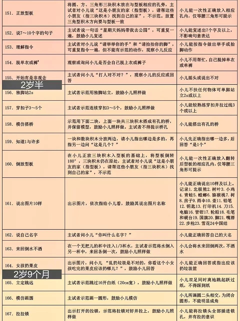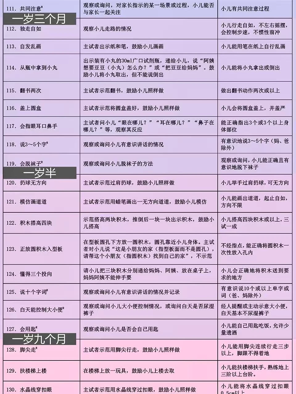 上周带宝宝去做儿保,🧑⚕️医生用的就是这份卫健委出的0-6岁儿童发育行为评估表📝 这表格可详细了,按月龄把宝宝应该会的小技能都列出来了,新手爸妈照着这个在家做早教特别方便~ 好多儿童🏥和专业机构都用它,比网上找的杂七杂八的资料靠谱多啦! 🌈已经按月龄用不同颜色区分好了,宝宝现在该会啥、接下来要练啥,一眼就能看清楚,真的超实用!建议收藏起来,随时翻出来对照着做哦~