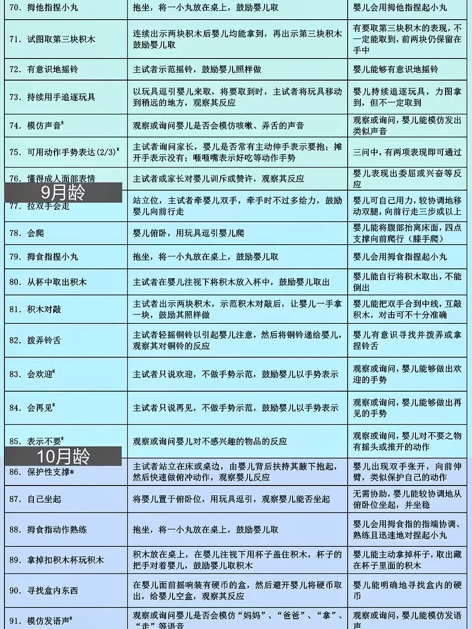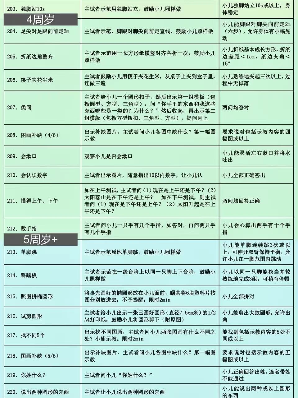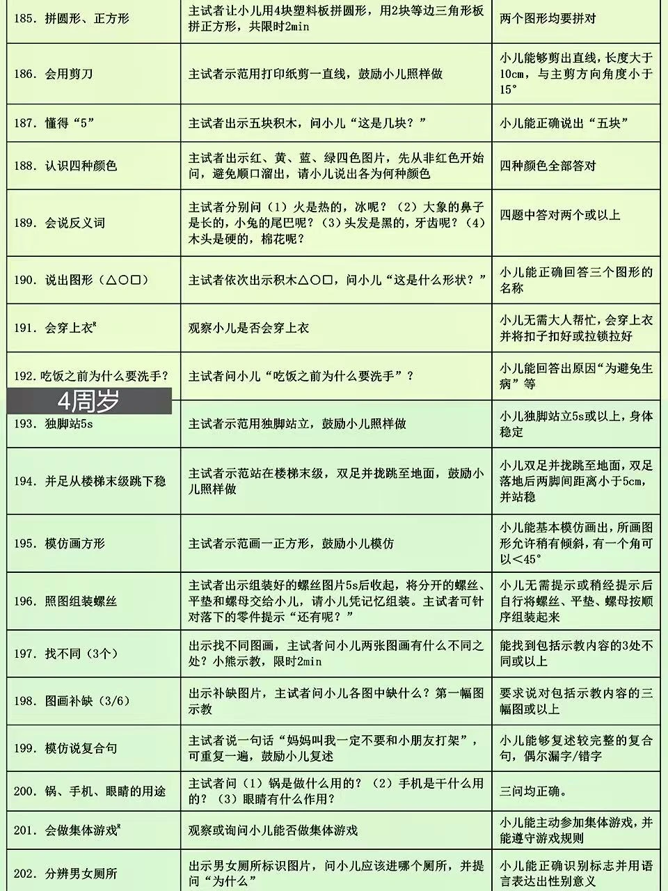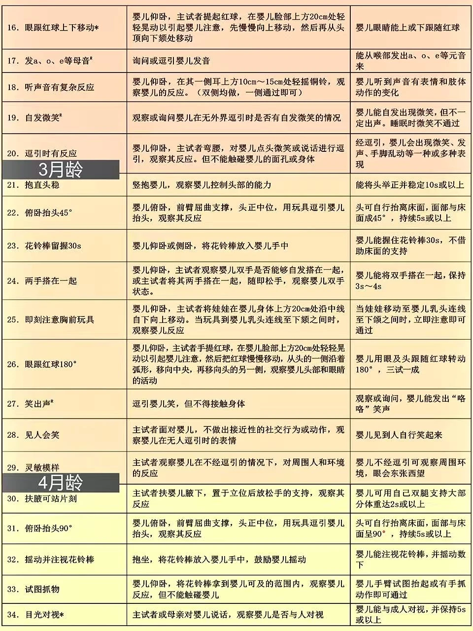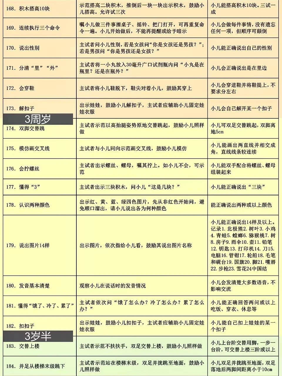 上周带宝宝去做儿保,🧑⚕️医生用的就是这份卫健委出的0-6岁儿童发育行为评估表📝 这表格可详细了,按月龄把宝宝应该会的小技能都列出来了,新手爸妈照着这个在家做早教特别方便~ 好多儿童🏥和专业机构都用它,比网上找的杂七杂八的资料靠谱多啦! 🌈已经按月龄用不同颜色区分好了,宝宝现在该会啥、接下来要练啥,一眼就能看清楚,真的超实用!建议收藏起来,随时翻出来对照着做哦~