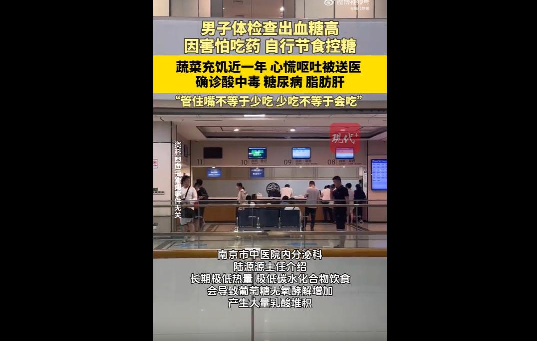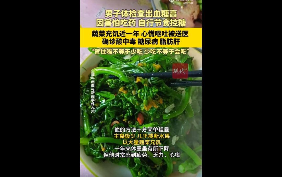 一年前,许先生确诊2型糖尿病伴肥胖,因惧怕吃药,自行极端节食控糖,主食极少、戒水果,仅靠大量蔬菜充饥。 持续一年后,他突发不适送医,被诊断为乳酸性酸中毒,还伴随多种并发症。医生表示,长期极低热量饮食导致能量枯竭、代谢异常,是中毒的主要诱因。 患上糖尿病确实需要饮食干预,但这绝不等于极端节食、断碳断营养。 许先生陷入了最危险的养生误区:把药物当成洪水猛兽,却把极端节食奉为控糖良方,主食几乎不吃、水果彻底戒断,仅靠大量蔬菜果腹,看似是自律控糖,实则是拿身体开玩笑,是对医学常识的彻底漠视。 长期极低热量、极低碳水的饮食,让身体长期处于能量“枯竭”状态,代谢路径彻底紊乱,最终引发乳酸性酸中毒。 这种并发症凶险至极,全身细胞浸泡在酸水中,短短数小时就可能陷入昏迷、危及生命,远比高血糖的危害更紧急、更迅猛。 即便捡回一命,脂肪肝、高尿酸、维生素D缺乏等一堆并发症,也成了伴随终身的健康隐患。 控糖的核心是科学饮食、合理用药、规律作息,而非一刀切的节食。 管住嘴是均衡膳食、粗细搭配,而非剥夺身体必需的能量;控血糖是循序渐进、谨遵医嘱,而非极端自律、讳疾忌医。 别让无知害了自己,更别拿生命赌所谓的“养生偏方”。 面对慢性病,摆正心态、相信科学、谨遵医嘱,才是对自己最负责的态度。 极端节食换不来健康,盲目抗拒只会加重病情,唯有科学管控、理性对待,才能守住健康底线,远离致命风险。