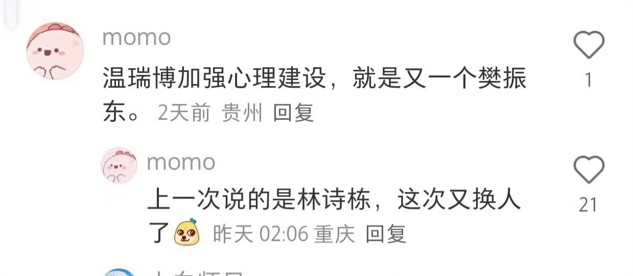 🏓“温瑞博加强心理建设,就是又一个樊振东。”去年,这句话的主语是林诗栋,今年换成了温瑞博。 ~~~~~~~~~~~ [微风]这当然都是美好的愿望!其实吧,他俩谁都成不了樊振东。 别的不说,就光论年龄,目前,一个19岁,一个21岁。 而樊振东18岁就已经打进世界杯决赛了,19岁就已经拿到世界杯金牌了🏆。 [微风]林诗栋,温瑞博,各自努力,做最优秀的自己就好! ~~~~~~~~~~ (截图来自网络,照片来自WTT世界乒联)