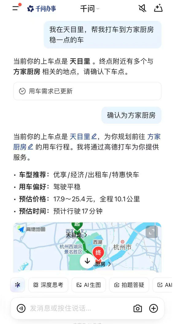 千问上线AI打车给到一个夯!今天和闺蜜约会不知道去哪吃,让千问给我推荐了几家好吃的私房菜馆,选好了餐厅,不用再复制地址,我直接跟千问说“帮我打一辆到这家菜馆的车,要平稳一点”,就能直接打到我满意的车了!果然一路上师傅开得也稳,我俩在车上悠哉悠哉补了个妆!这种又能找好去处,还能马上安排前往的能力,完全不输私人助理~