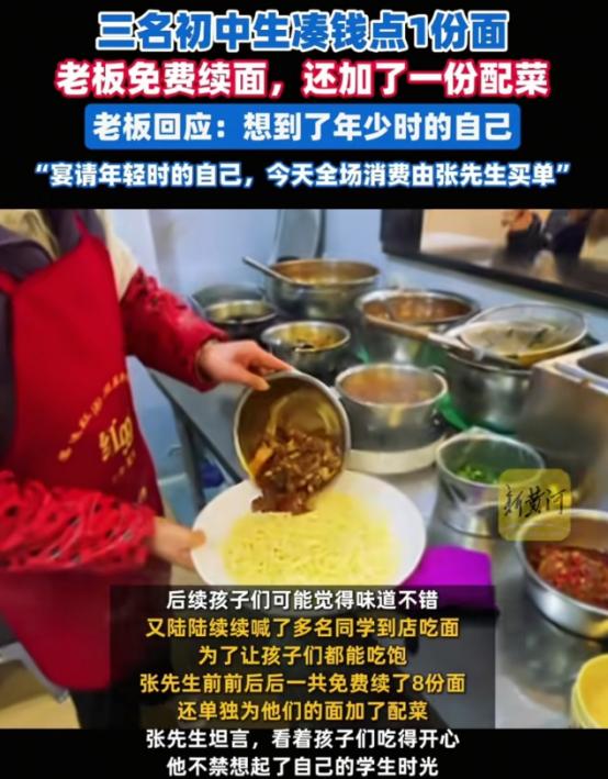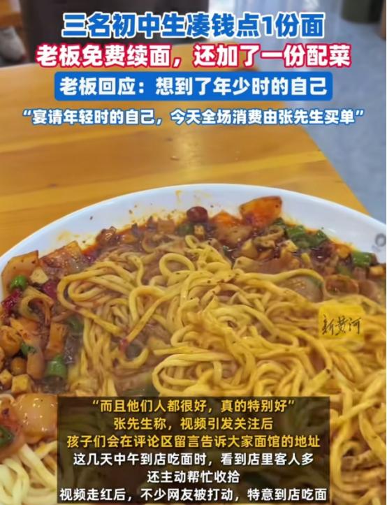 泪目!陕西西安,老板看到3个学生在门口犹犹豫豫,好像在凑钱吃饭,便主动招呼他们进店。3个孩子点了一份面分着吃,老板怕他们吃不饱,主动给他们续面,让孩子们都能吃饱。万万没想到,3个孩子竟然又叫来了10多名同学到店吃面,老板前前后后给他们免费加了8份面,老板:就当宴请年轻的自己了!   事情是3月13号中午发生的,这家面馆开在西安街头,老板姓张,是个95后,自己创业开了这家小店,赚的都是起早贪黑的辛苦钱。   那天中午,他正忙着招呼店里的客人,一抬头就看见三个穿着校服的初中生,在面馆门口来回徘徊,手里攥着皱巴巴的零钱,凑在一起小声嘀咕,眼神时不时瞟向店里的餐牌,又赶紧低下头数钱,那股局促又渴望的样子,一眼就能看出是在凑钱吃面。   张老板看在眼里,心里一下子就有了触动,没有多想,就快步走出去招呼孩子们:“你们先进来,不管钱够不够,先进来看一下,别饿着肚子。”就这么一句接地气的话,化解了孩子们的尴尬,三个孩子红着脸,小心翼翼地走进了店里。   进店后,孩子们盯着价目表看了好久,最后只点了一份店里的招牌爆肚面,然后坐在一桌,等着面端上来后,你一筷子我一筷子地分着吃,生怕吃快了不够别人吃。   张老板把这一切都看在眼里,他知道,半大的孩子正是长身体的时候,一碗面哪够三个人吃,肯定得饿肚子。没等孩子们开口,他就主动上前,免费给他们续了面,还悄悄加了配菜,就想让孩子们能多吃点。   万万没想到,这碗面合了孩子们的胃口,吃完之后,他们又陆陆续续叫来了十多名同学,都是和他们一样穿着校服的初中生,张老板也没生气,反而更心疼这些孩子,只要孩子们说不够吃,他就免费续面,前前后后算下来,一共免费续了8份面,全程没有半点不耐烦。   有人问张老板,开店就是为了赚钱,这么免费续面,不亏吗?他笑着说:“说白了,我也是从那个年纪过来的,上学的时候家里条件窘迫,也经常和朋友凑钱点一份东西分着吃,那种手头紧的滋味,我到现在都记得。现在给孩子们续面,就当是宴请年轻时的自己了,不算啥。”   其实不用多分析也能想明白,张老板不是多有钱,只是懂得共情,他的善意里,没有居高临下的施舍,只有发自内心的体谅。   而这些孩子也特别懂事,没有因为老板免费续面就理所当然,视频走红后,他们会在评论区留言,告诉网友面馆的地址,帮老板宣传,这几天中午去吃面,看到店里客人多,还会主动帮忙收拾桌子擦碗筷。   后来,不少网友被张老板的善举打动,特意顺着线索找到这家面馆,专门来吃一碗面,用实际行动支持他。张老板说,他也没想到,自己一个随手的举动,能收获这么多温暖。   说真的,这就是最动人的烟火气吧。一碗热面,一份善意,没有轰轰烈烈,却藏着最朴素的温柔。张老板宴请的不仅是年轻时的自己,更是一份跨越时光的善意传承,而孩子们的懂事,也让这份善意有了最好的回应,双向奔赴的温暖,大概就是这样吧。
