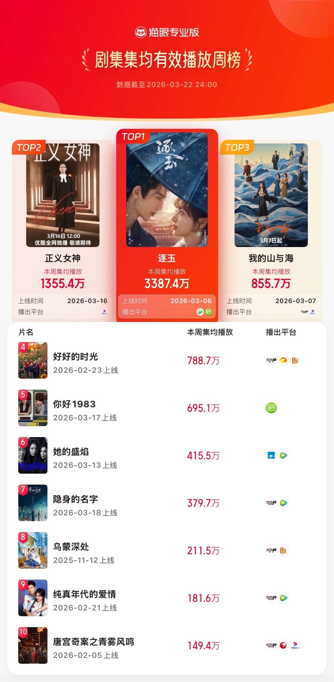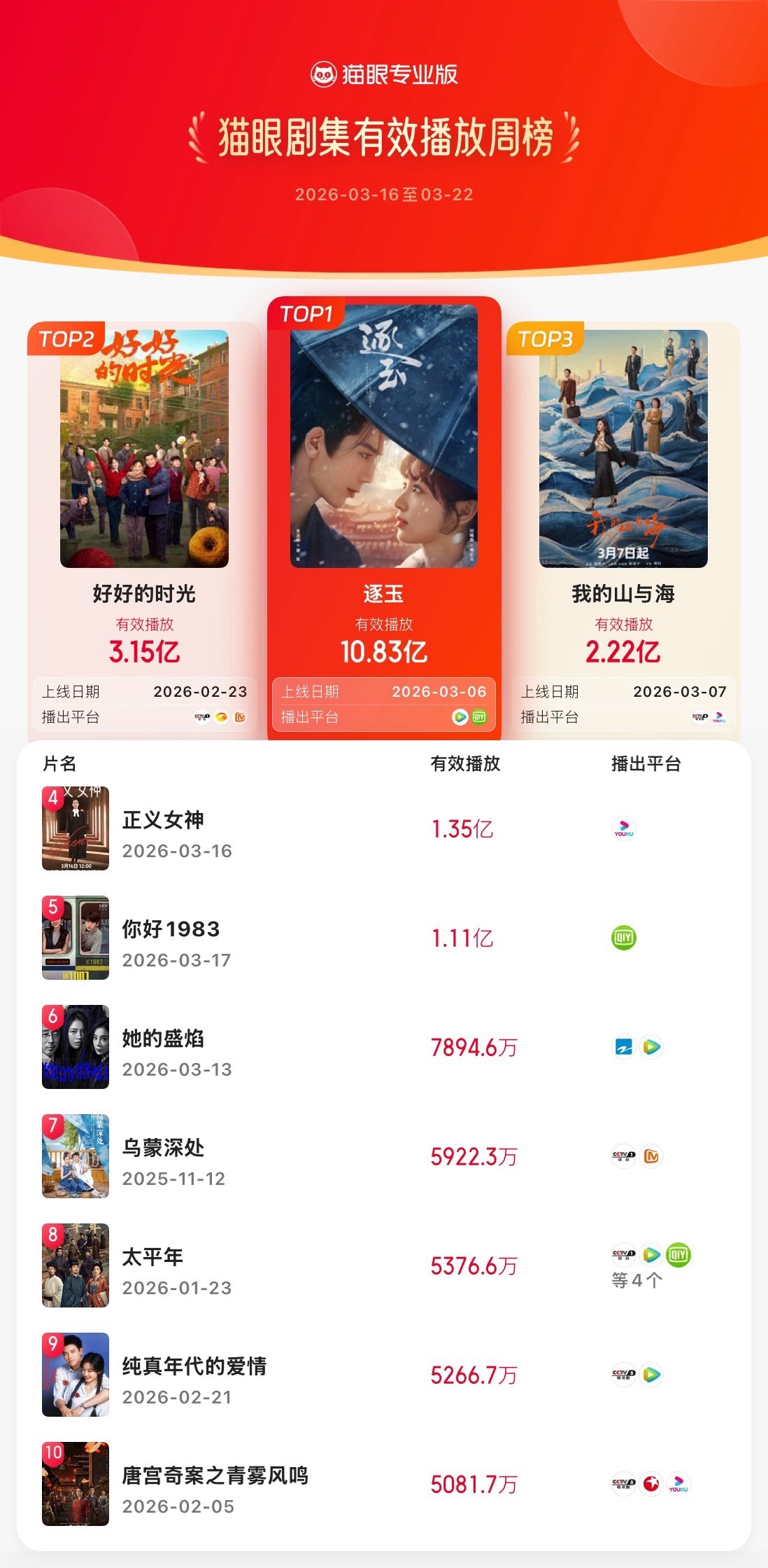 逐玉蝉联三榜周冠 据猫眼专业版数据,(排名不分先后)领衔主演网络剧《逐玉》热播中,蝉联三榜周冠!分别登顶2026年第11周猫眼剧集热度、有效播放和集均有效播放周榜。