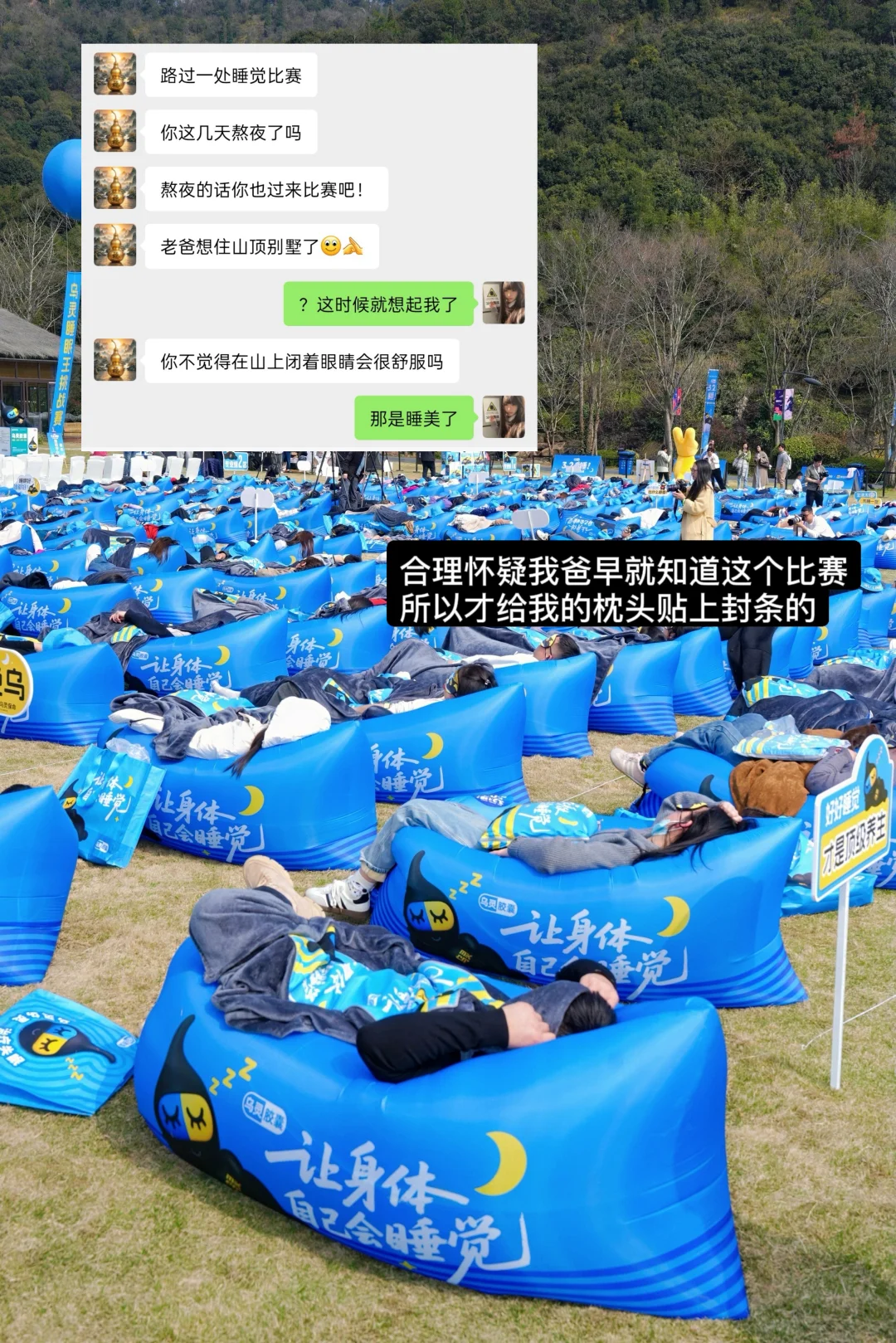 我爸真就是一天不嘚瑟浑身难受 出去旅个游恨不得说八百遍 还没出发就开始在家阴阳我只会睡觉 天菩萨 他自己还不是一天到晚睡懒觉!!! 最搞笑的是他去湖州玩正好遇上了「乌灵睡眠王挑战赛」 他一想到平时睡得跟像猪一样的我 就开始后悔没带我来 哈哈哈哈哈哈 我看冠军还能获得山顶别墅房的房券 可给我爸心疼坏了 按照我的睡眠质量,提前熬一宿不睡觉 再加上现在上美团App搜索「321 睡眠日助好眠」 可以领75元睡眠优惠券,下单助眠好物30分钟就能送到 说不定还真能拿个奖呢嘿嘿嘿