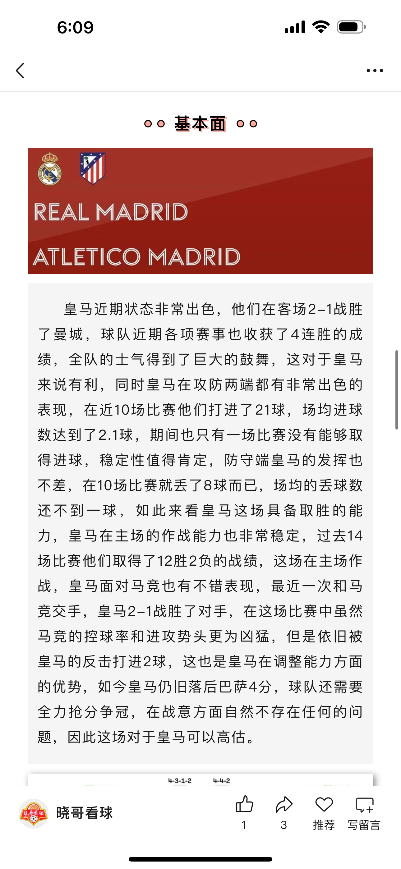 昨日公推皇马成功获得好评成绩,这场比赛还是抓住了马竞防守端能力的缺陷,因此在皇马能够打进3球的情况下,这场马竞难有胜算,不过这场皇马确实也赢的不算轻松,最终以3:2取胜,仅有一球的优势,确实过往他们面对马竞的优势不明显,这场能够一球好评,算是合理范围内。体彩足球预测体育赛事皇马马竞