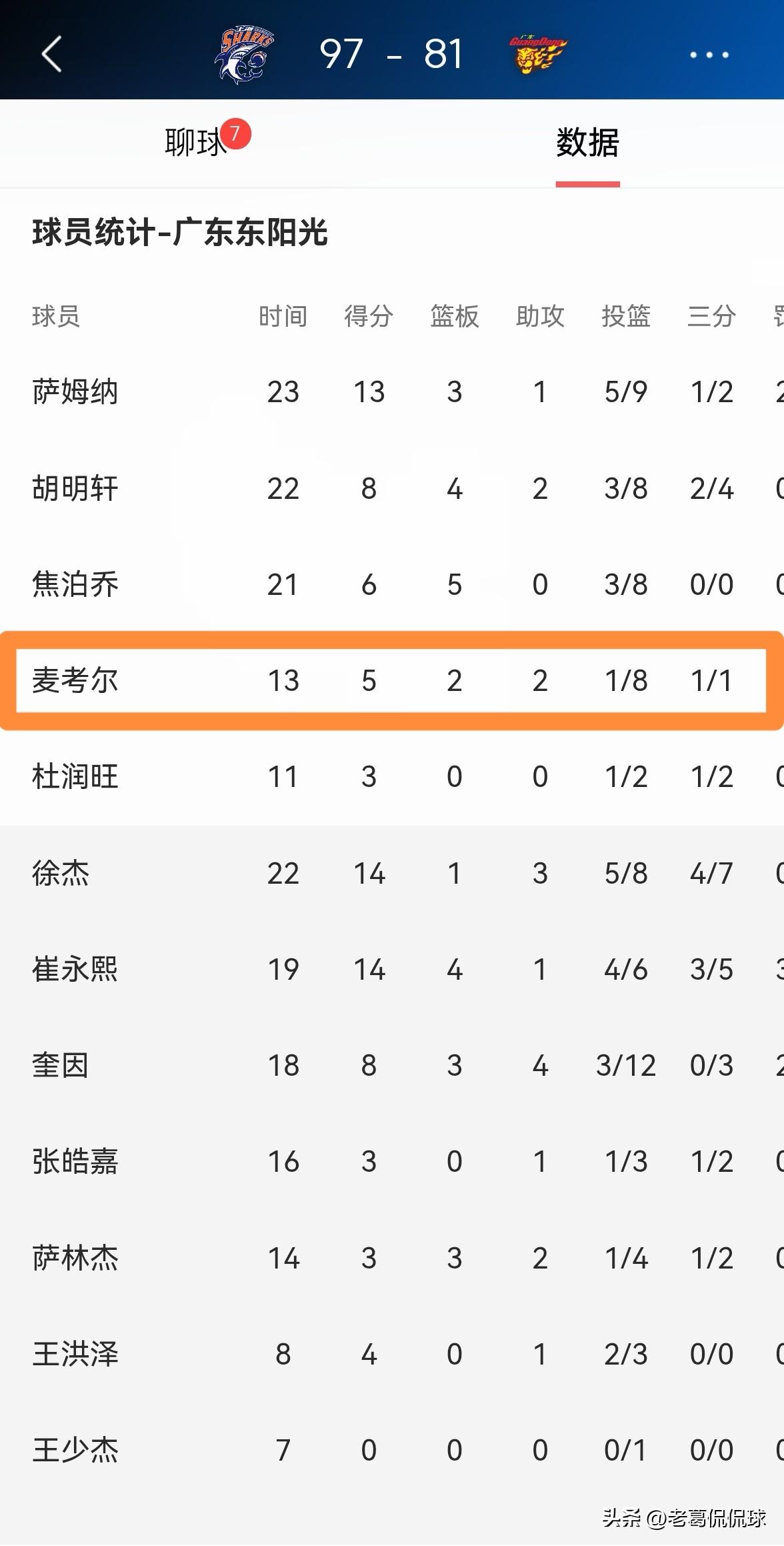我强烈建议广东东阳光主帅杜峰弃用麦考尔!在今天广东东阳光客场以81:97输给上海久事的比赛中,麦考尔的表现简直就是一场灾难。 全场比赛下来,麦考尔首发出战13分钟,投篮8中1,其中三分球1中1、罚球2中2极其低效的得到5分,还有2次失误,他的场上正负值为-12。 事实再次证明,麦考尔确实是难堪大用,杜峰教练应该在接下来的比赛中弃用麦考尔才是上策。