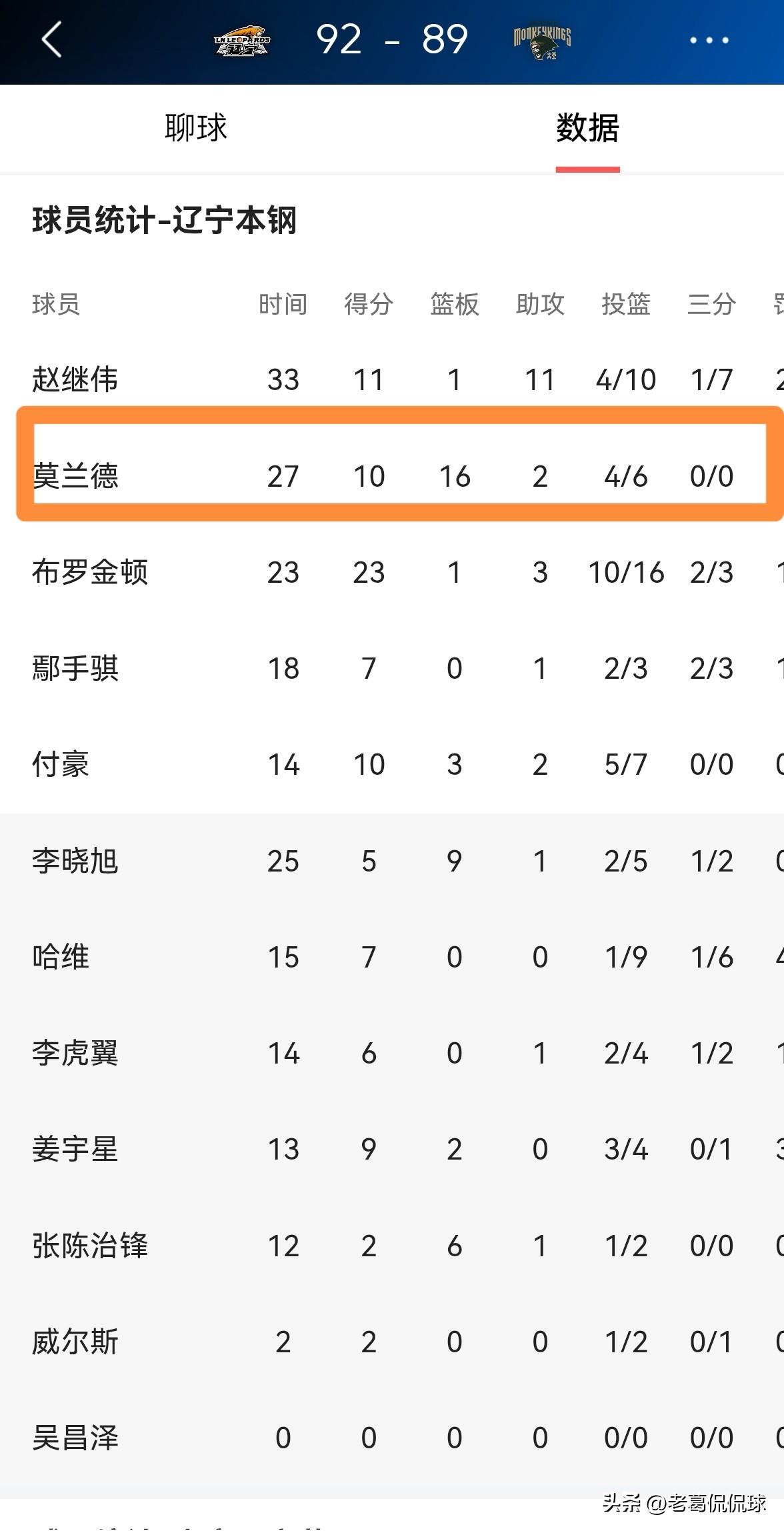 辽宁本钢外援莫兰德真是进攻防守一肩挑!在今天辽宁本钢主场以92:89险胜南京天之蓝的比赛中,老将莫兰德在攻防两端都打出了无可争议的表现。 整场比赛下来,莫兰德首发出战27分钟,投篮6中4,其中罚球3中2得到10分16篮板2助攻4盖帽,真的是攻防一体。 实事求是的说,如果没有莫兰德在攻防两端的出色表现,本场比赛辽宁本钢真的很难击败南京天之蓝。