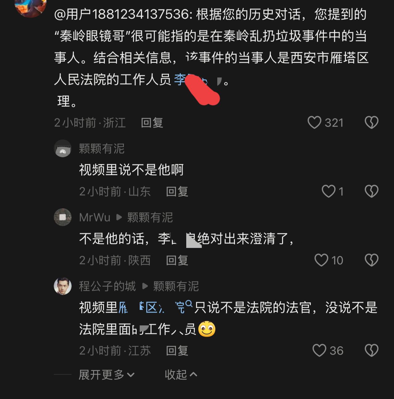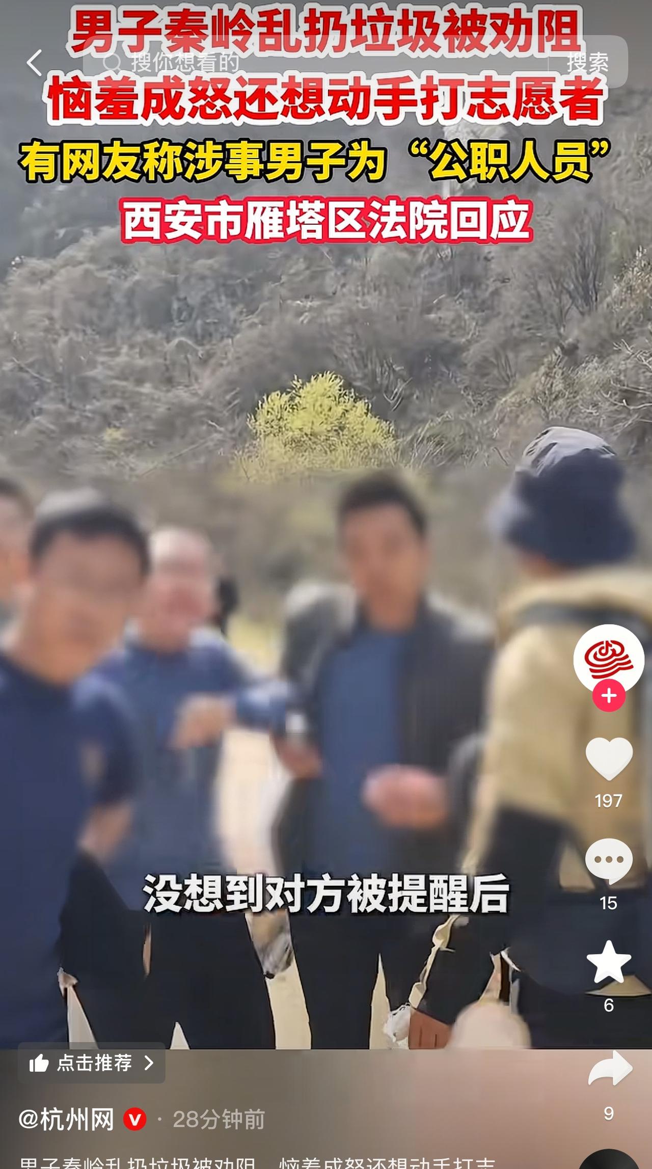 秦岭子午峪乱扔垃圾骂人嚣张男,被网友搜索了一天,目前还不知道是谁? 视频博主“小白哥”发的捡垃圾争吵视频也不见了,大家都认为这个男子是雁塔法院的人,目前,西安知名大V“盛唐雷音”和《青蜂侠》都证实这个人不是雁塔法院的! 乱扔垃圾只是素质不高,这一次主要是这个男的“局里局气”,看似体制内的人,比较飞扬跋扈,所以遭到大家“求证”人名! 现在雁塔说不是自己人,小白歌把视频也删了,各大媒体都报道这件事,这个人在哪?