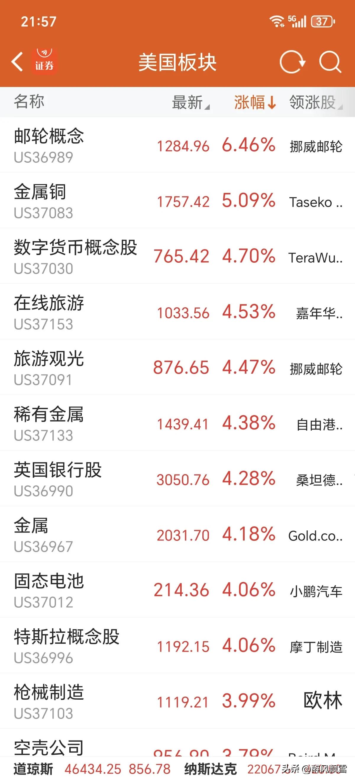 美市开盘高开高走 明天大A跟涨:控仓为上,目前仅为反弹,不能确认为反转!!! 美市高开高走,三大指数集体大涨中阳(开盘30分钟数据):道琼斯涨1.79%,纳斯达克涨1.93%,标普500涨1.68%,市场情绪偏乐观,普涨。板块层面,邮轮、金属铜、数字货币等板块领涨,旅游观光、稀有金属等板块涨幅居前;基因编辑、乳业等少数板块小幅回调。纳斯达克中国金龙指数涨0.93%,中概股表现分化。整体来看,市场风险偏好提升,周期与消费板块领涨,科技股同步走强。