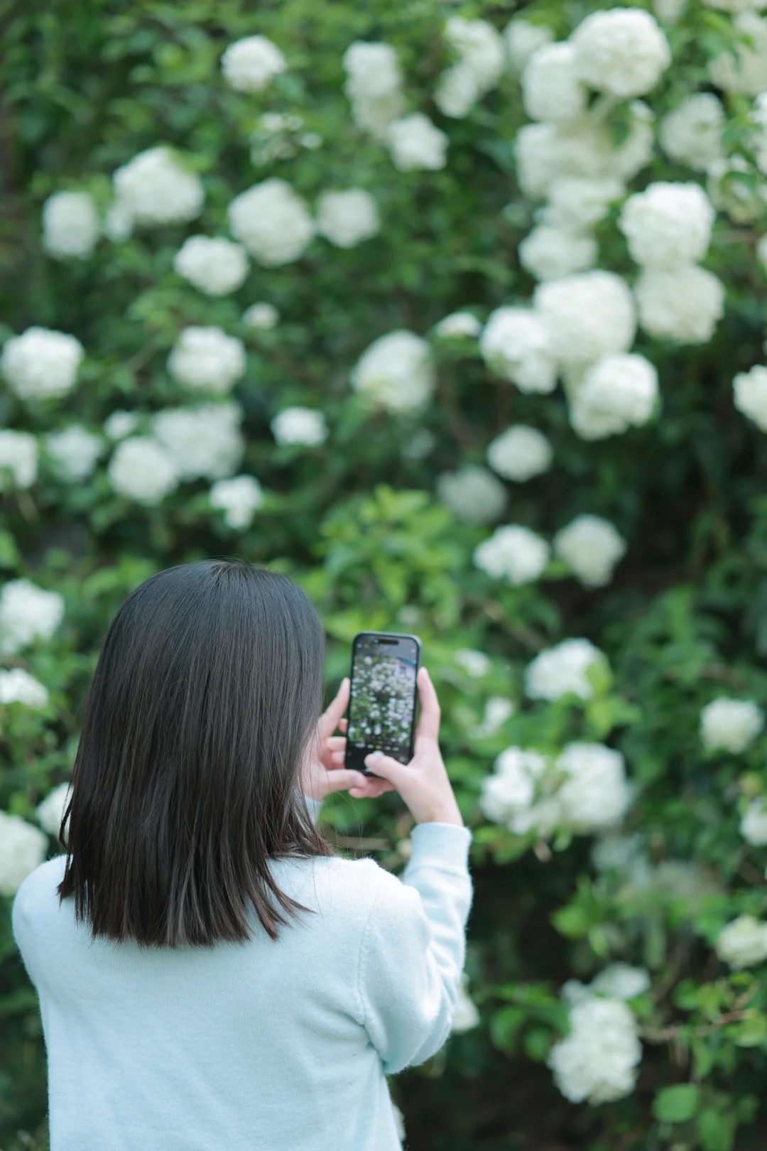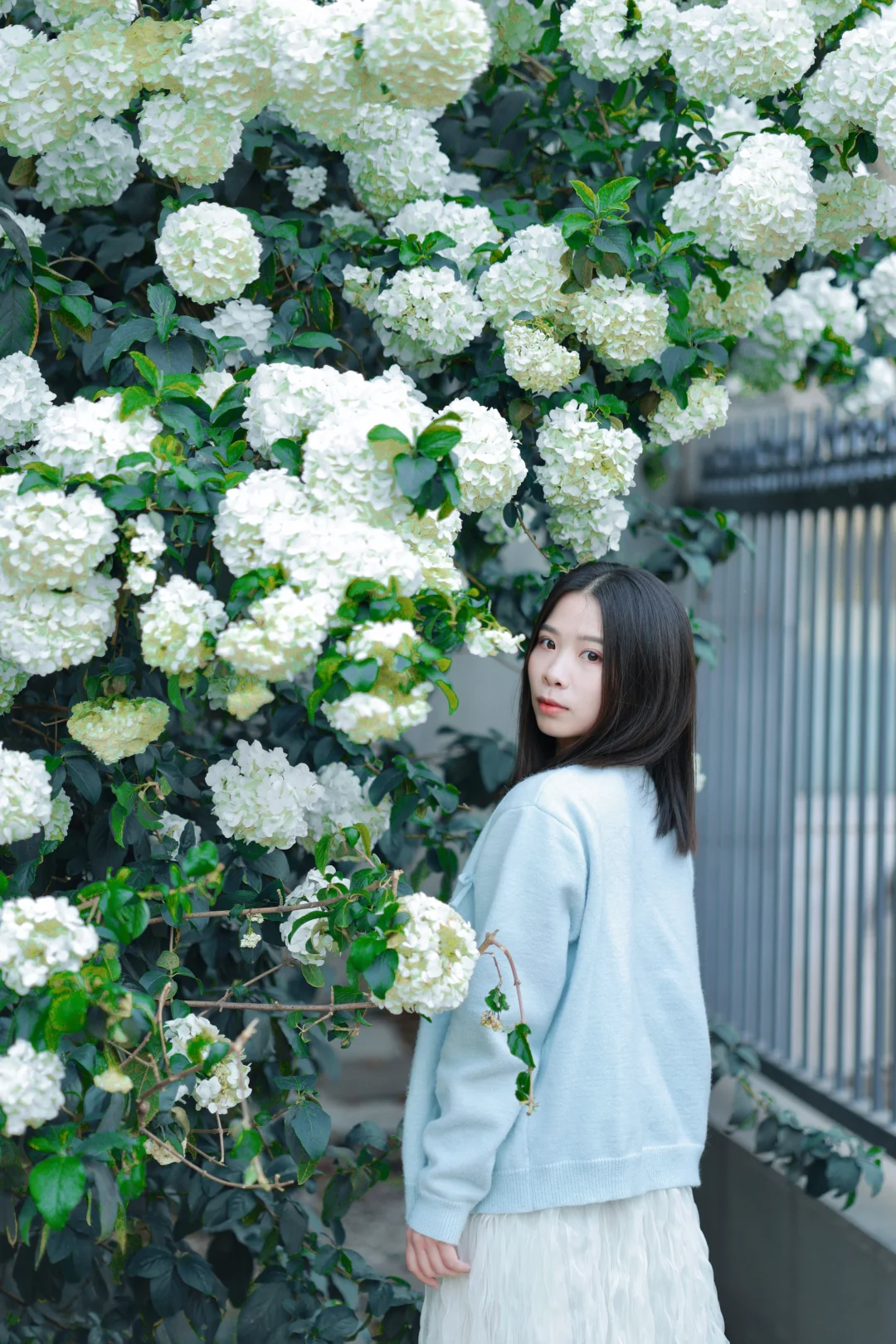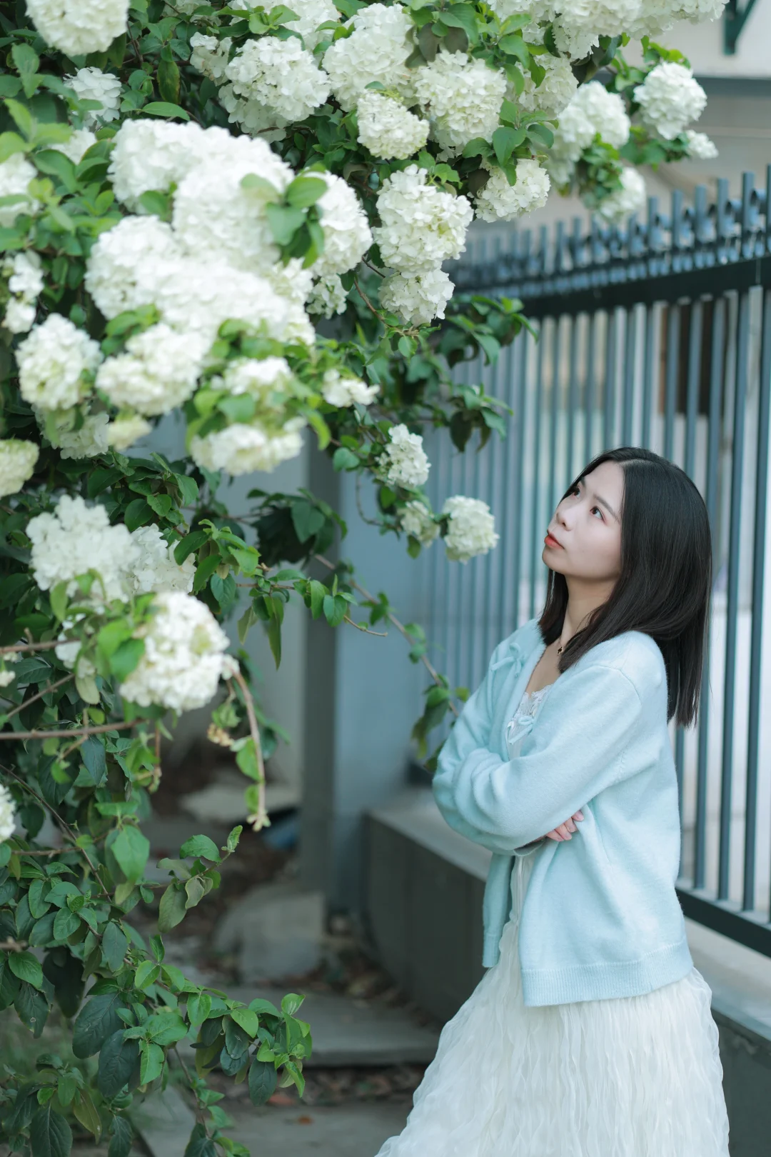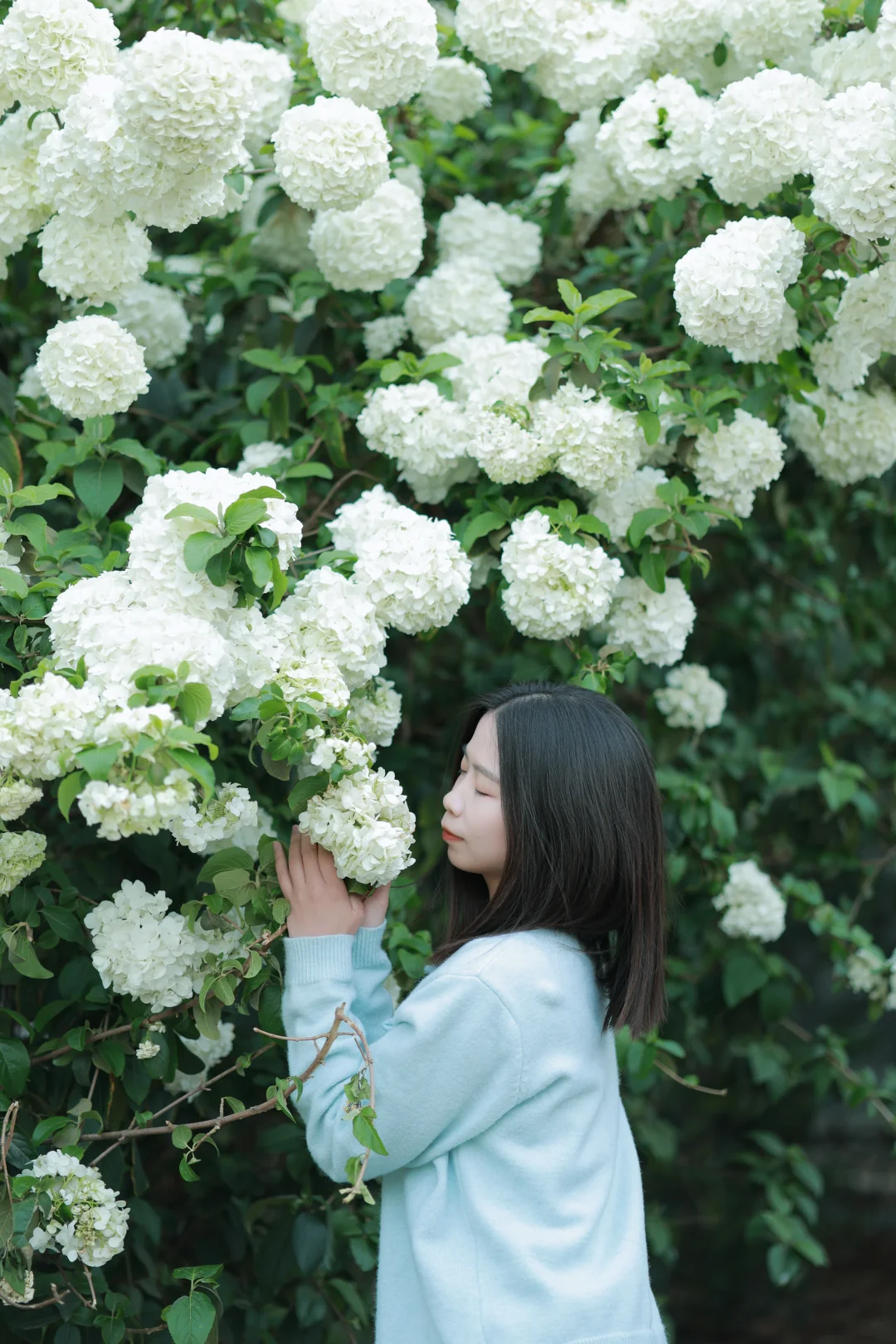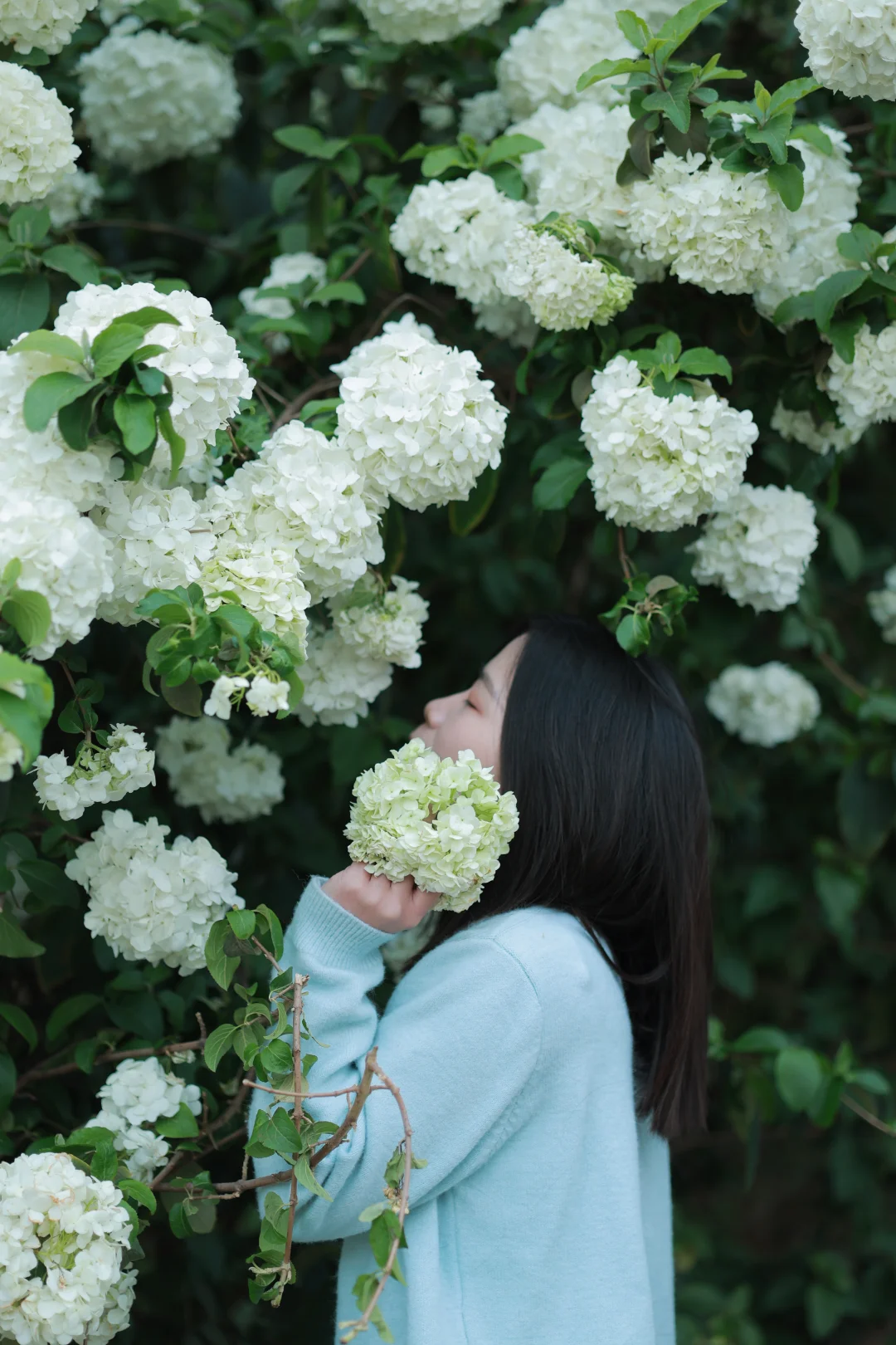 绣球开得茂密且低矮,非常适合拍人像。