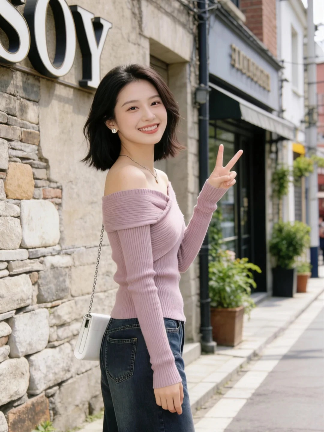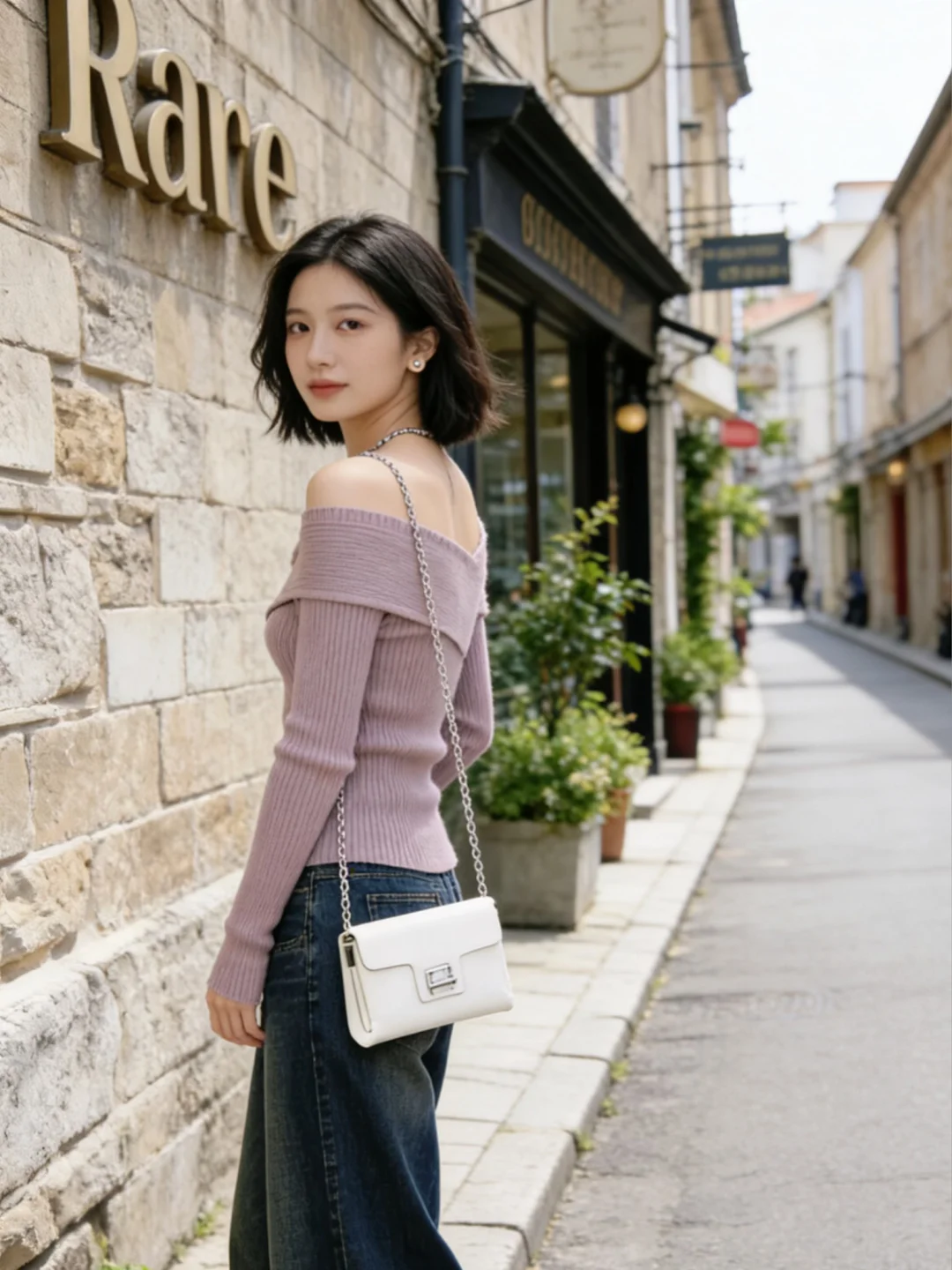 这件一字肩针织衫也太会了—— [害羞R]交叉设计刚好露出肩颈线,甜而不媚,软乎乎的坑条面料贴肤不扎,春天穿温度刚好; [天幕R]搭阔腿牛仔裤直接封神,松弛的裤型中和了上衣的精致感,走路带风还显腿长,随手一拍都是“韩系女高春日街拍”既视感。