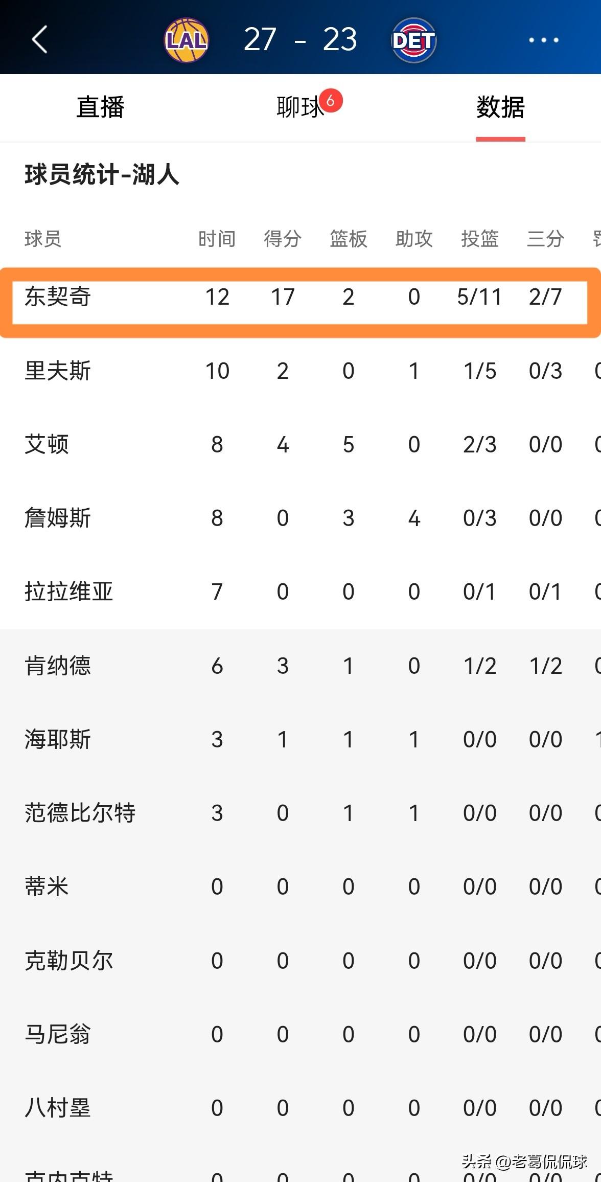 湖人当家球星东契奇真是太让队友尴尬了!在今天湖人客场挑战活塞的比赛中,目前双方的第一节比赛已经结束,湖人以27:23领先对手4分。值得一提的是,在第一节比赛中,东契奇大发神威,他在首发出战的12分钟里,投篮11中5,其中三分球7中2、罚球6中5狂轰17分,还有2篮板1抢断,他的场上正负值为+4。 湖人在第一节比赛中一共得到27分,而东契奇独得17分,也就是说湖人的其他上场球员合计得到10分,东契奇这个数据刷子真是太让自己的队友尴尬了。