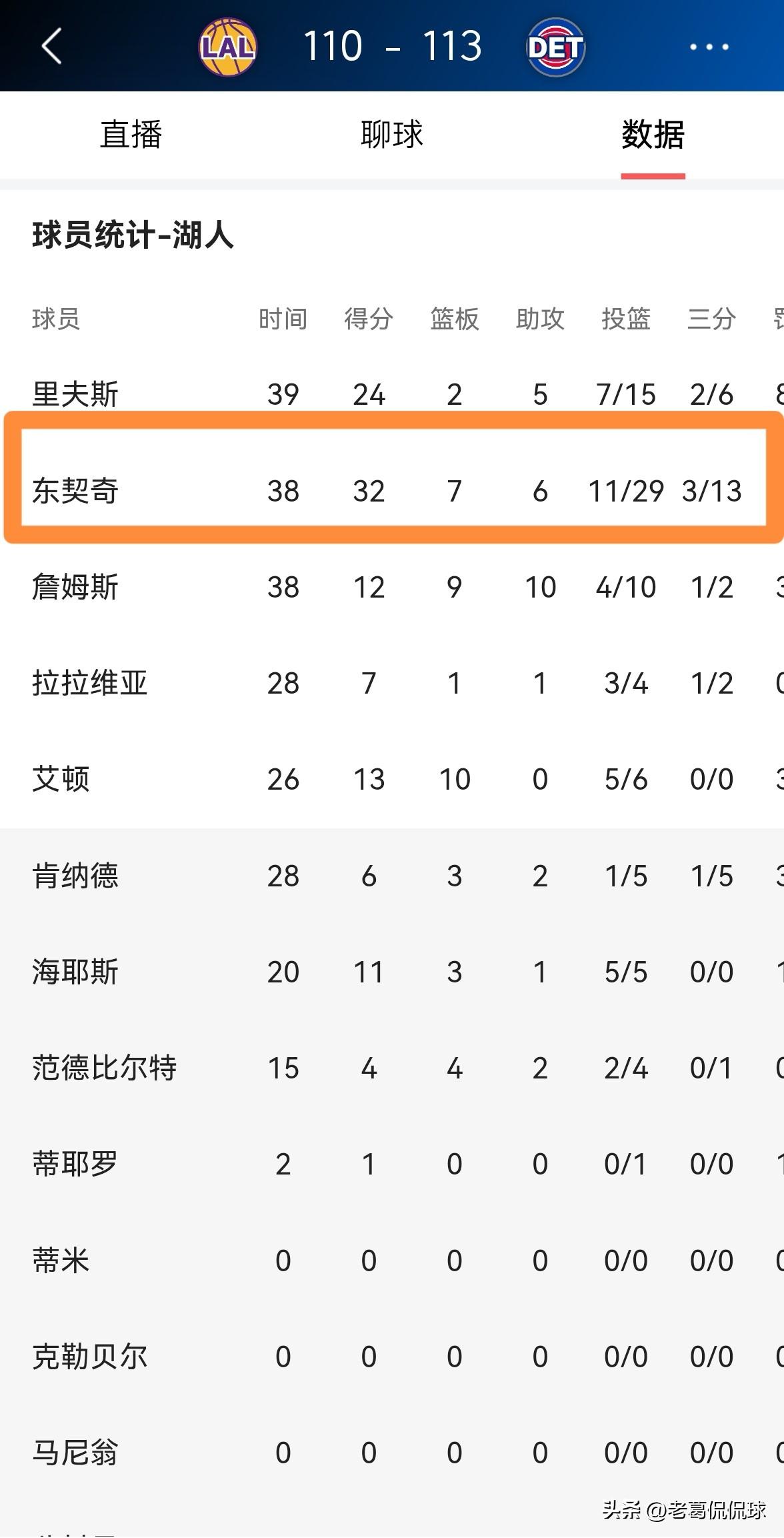 我对湖人巨星东契奇真是忍无可忍了,他就是一个浪投王!在今天湖人客场以110:113输给活塞的比赛中,东契奇在三分手感不佳的情况下依然选择浪投,他的投篮选择真是太糟糕了。 整场比赛下来,东契奇首发出战38分钟,投篮29中11,其中三分球13中3、罚球8中7非常低效的得到32分,还有3次失误。 坦白说,如果东契奇的投篮选择能够更合理一些,湖人完全能够赢下本场比赛,甚至有可能会大胜活塞。