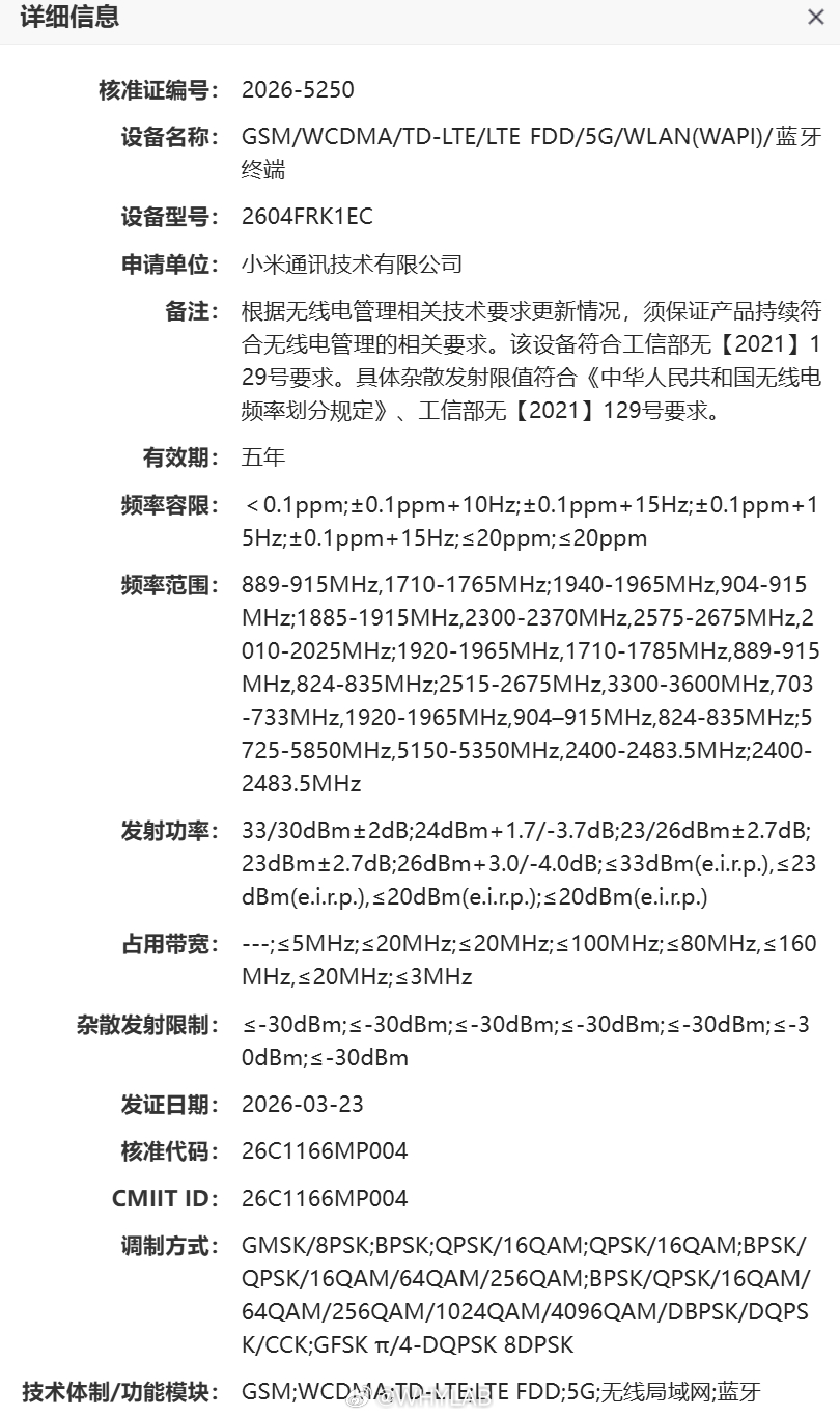REDMI K90 至尊版正式入网,型号2604FRK1EC,搭载天玑 9500
