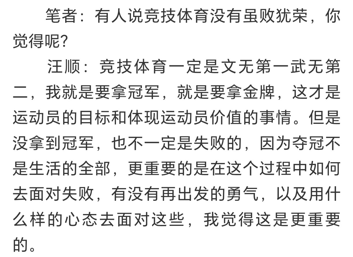竞技体育就是要拿冠军,但依然会受到年龄、伤病的困扰,如何自处很重要,汪顺给了答案