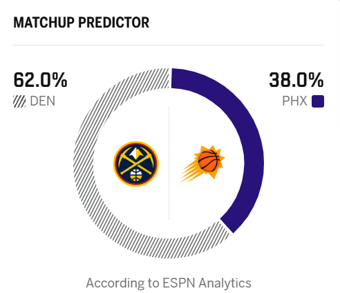 ESPN预测明日比赛:掘金胜率62.0%,太阳胜率38.0%