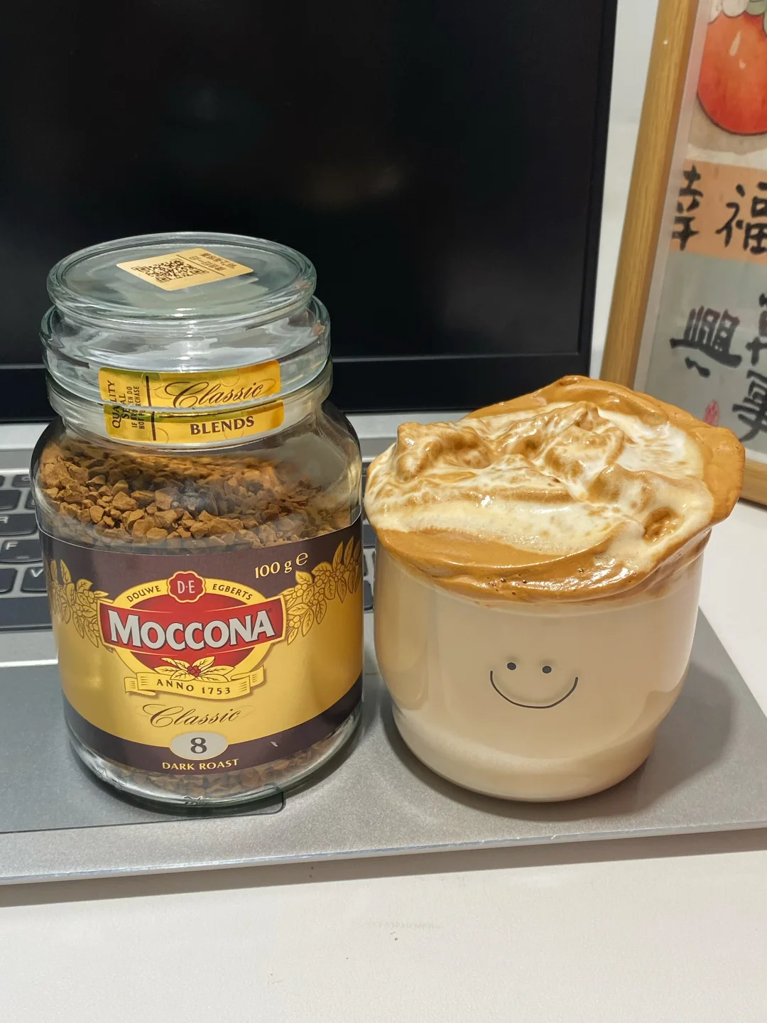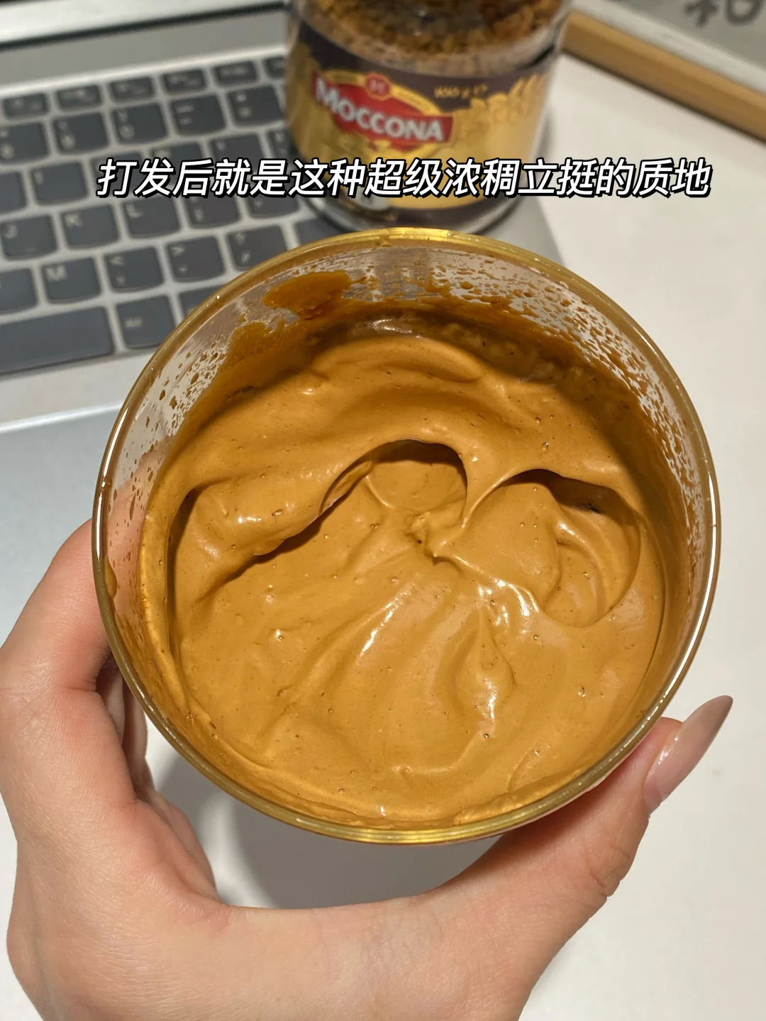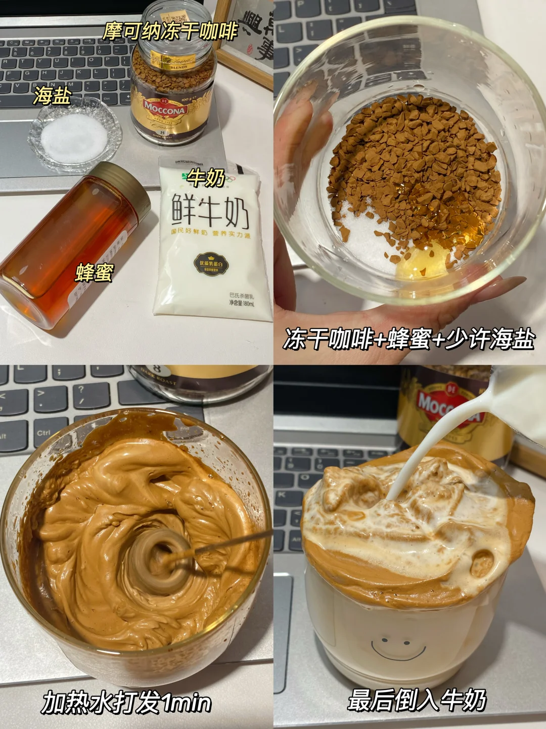 冻干咖啡+蜂蜜+海盐,加热水打发1min,到很绵密不软塌的质地,最后倒入牛奶,整个就会快速膨胀起来,很有意思!