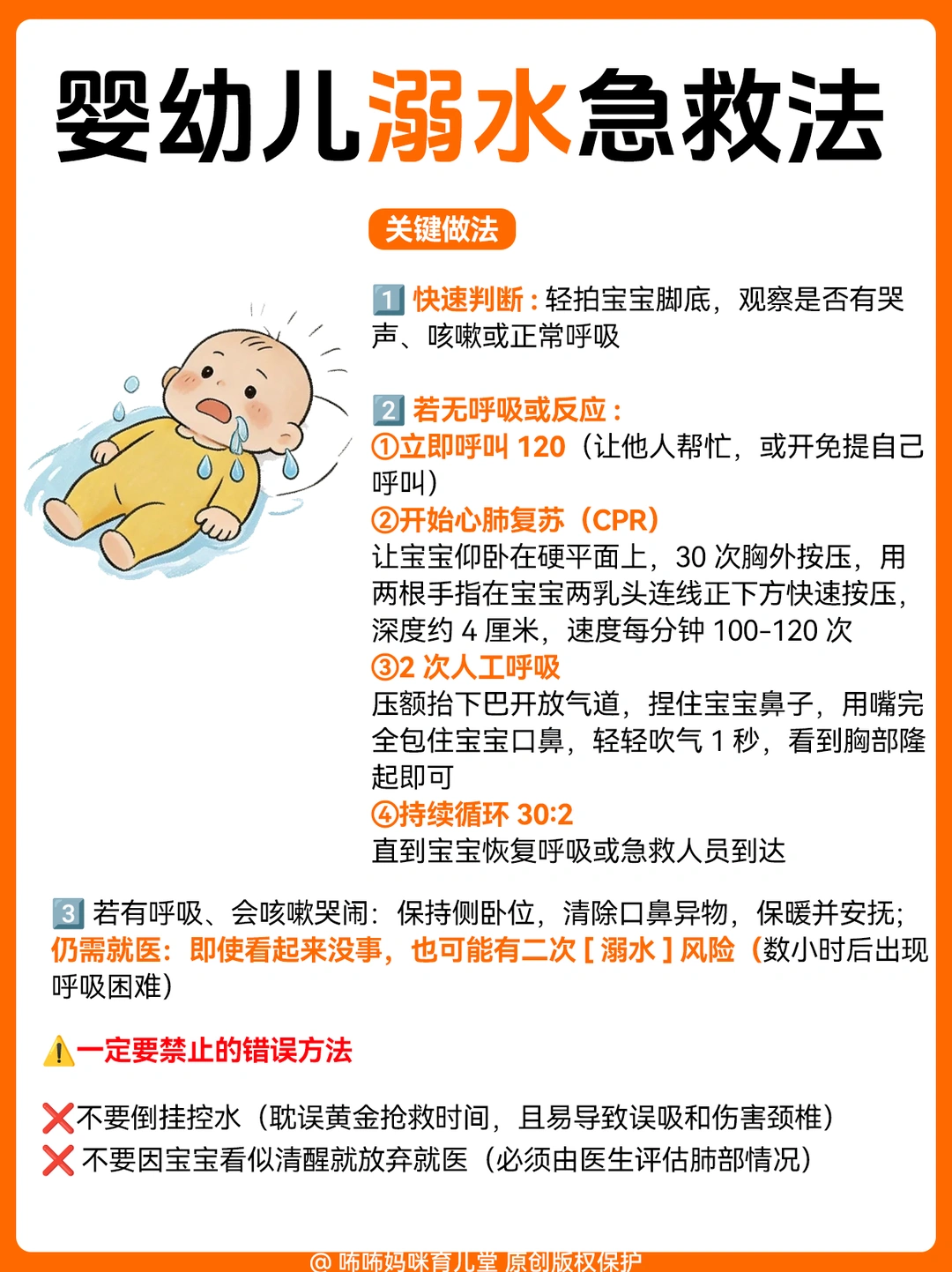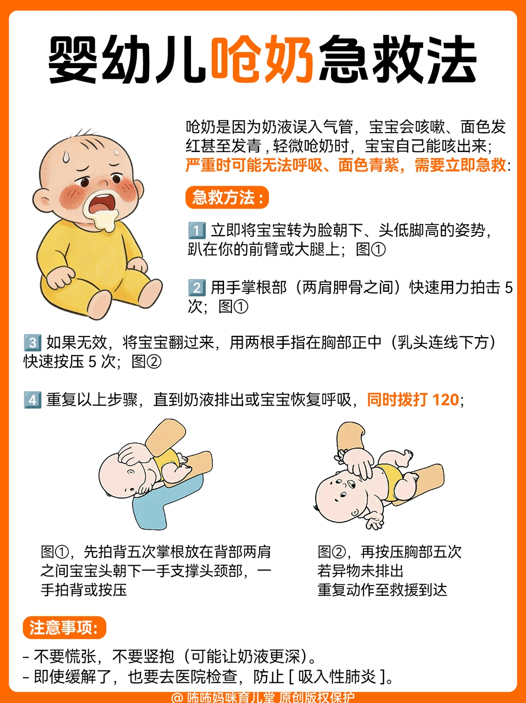 2️⃣异物卡喉/呛奶(最凶险):1岁内宝宝呛奶、卡异物,千万别竖抱!配图里的拍背+按压法,新手宝妈一定要练熟,每一步都不能错;