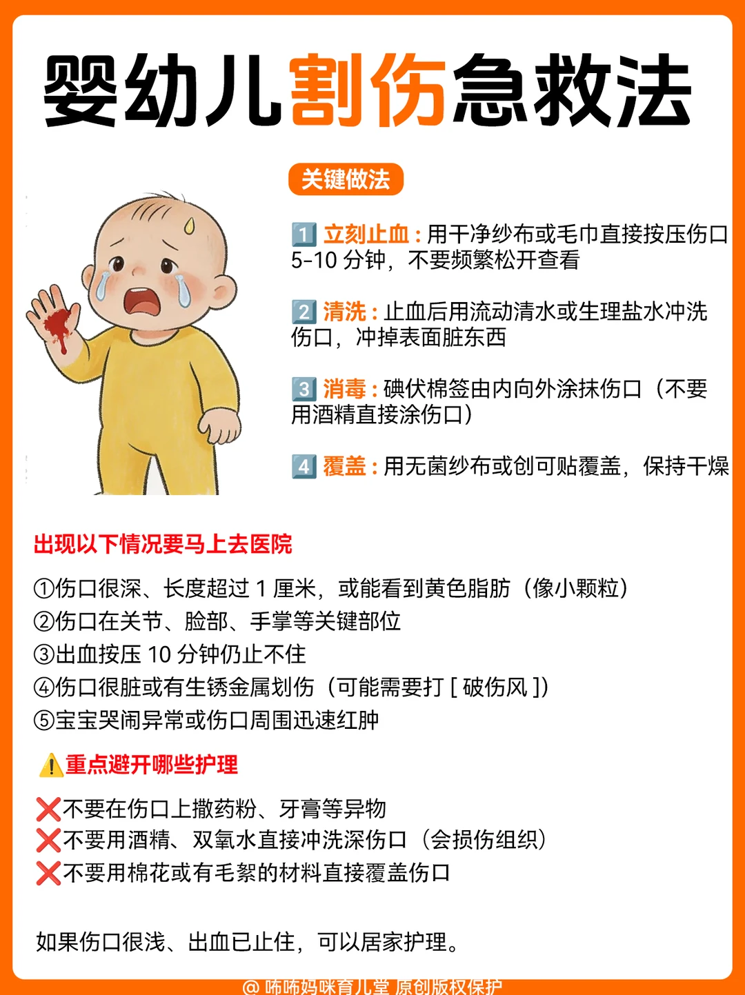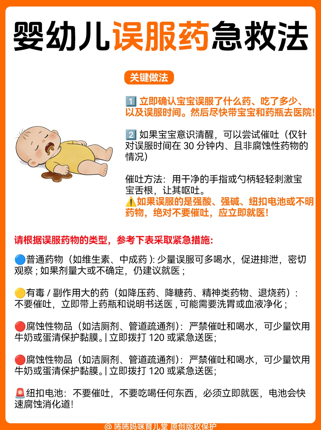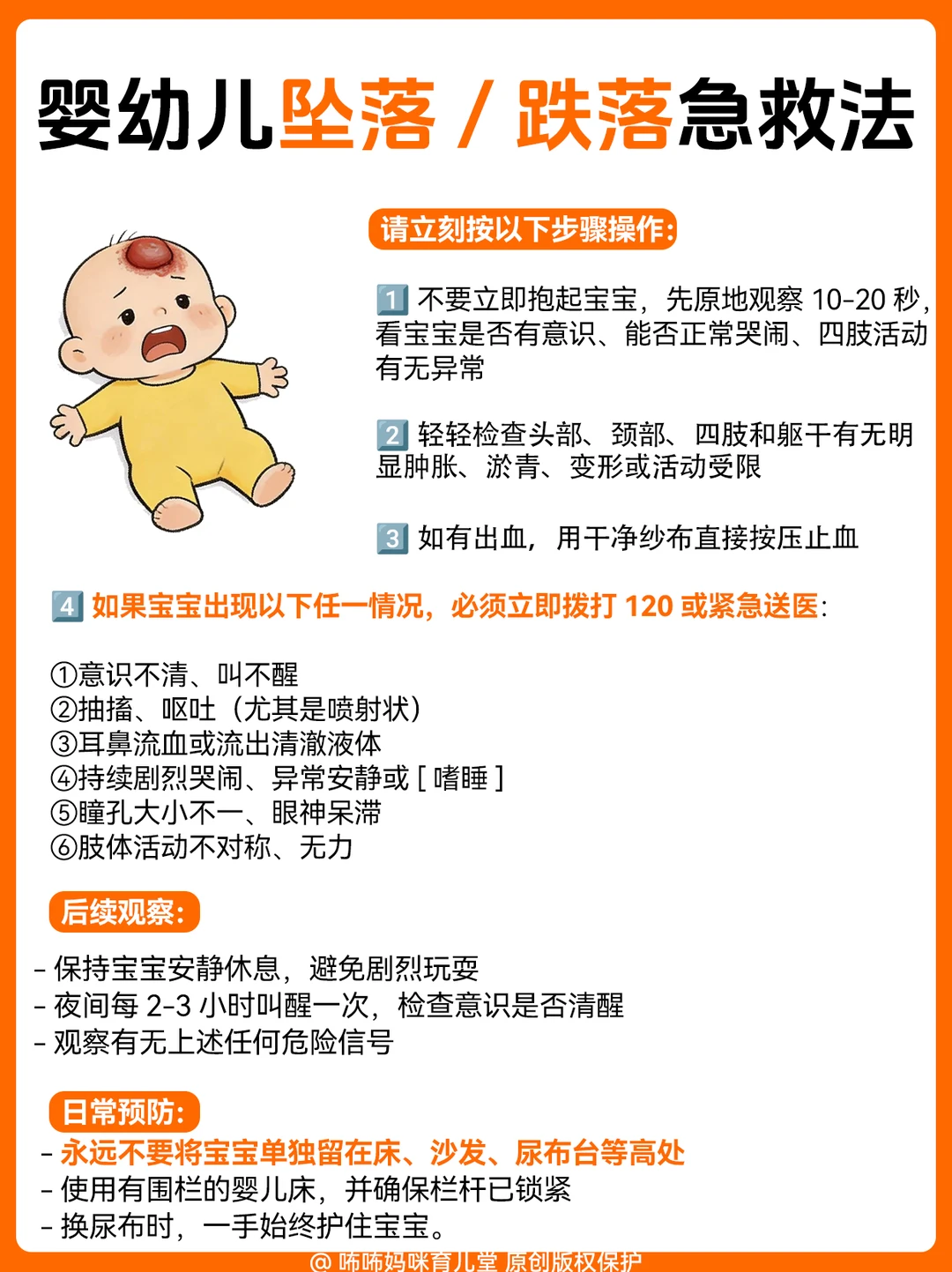 1️⃣ 坠床/跌落(最常见):宝宝摔下来别猛抱!先观察面色、有没有呕吐,配图里有详细的观察要点和急救步骤,照着做就对了;
