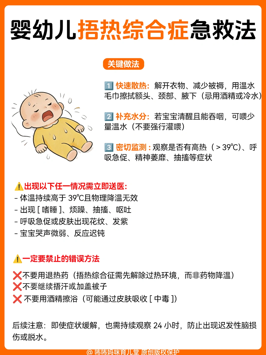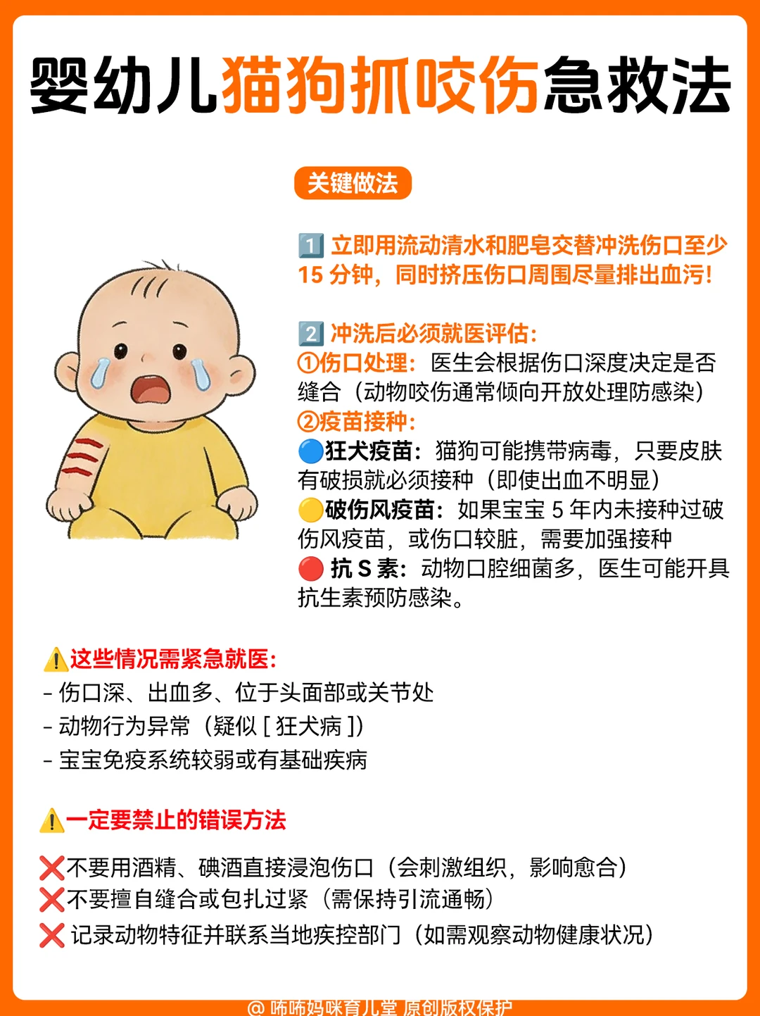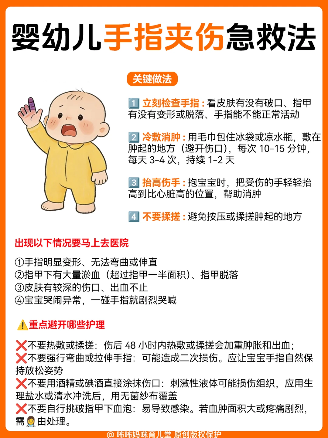 1️⃣ 坠床/跌落(最常见):宝宝摔下来别猛抱!先观察面色、有没有呕吐,配图里有详细的观察要点和急救步骤,照着做就对了;