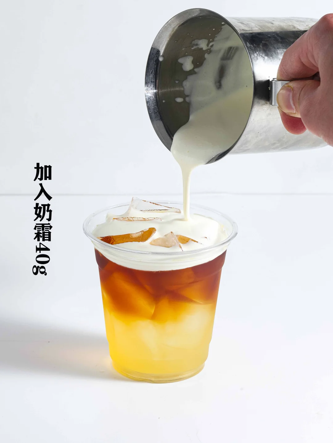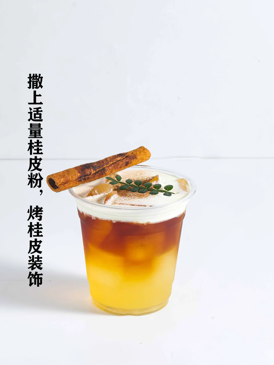 【肉桂冷萃配方】茉莉茶50ml+苹果汁100ml+奶霜40g+冷萃咖啡80ml+冰块七分满+桂皮粉+烤肉桂装饰