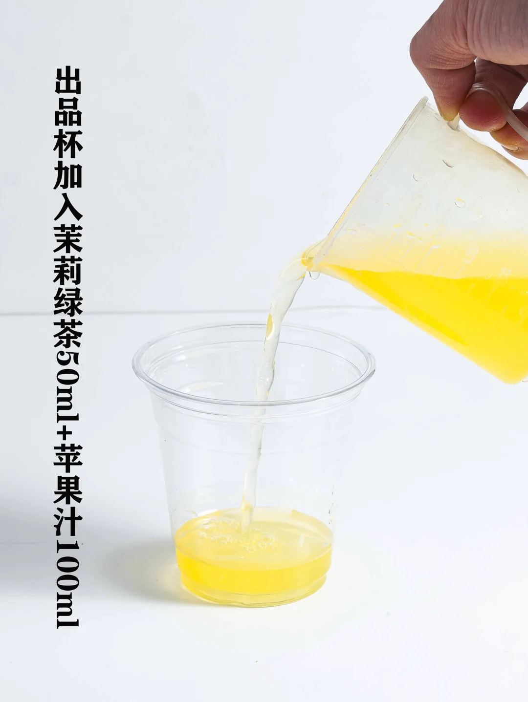 第一步,杯子里加茉莉茶和苹果汁,搅拌均匀