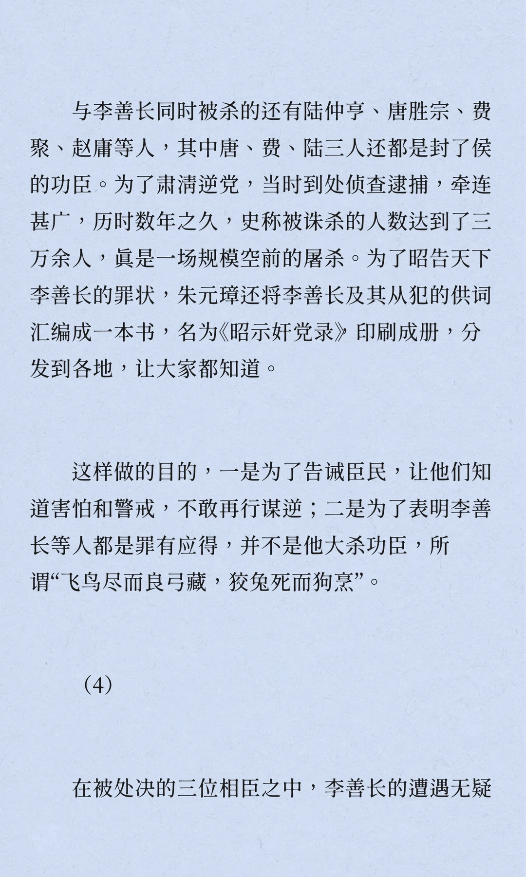 李善长因被举报知胡惟庸谋逆,被朱元璋诛杀,全家七十余人遇难。李善长辅佐朱元璋建国,功勋卓著,却因猜忌被杀。