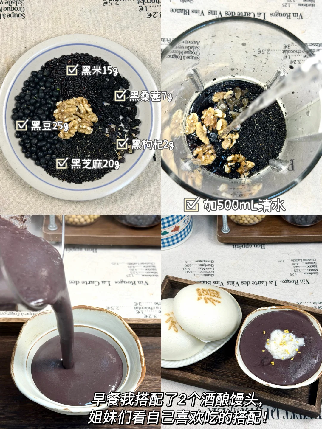 黑豆25g➕黑米15g➕黑芝麻20g➕黑桑葚7g➕黑枸杞2g➕核桃20g➕500mL清水