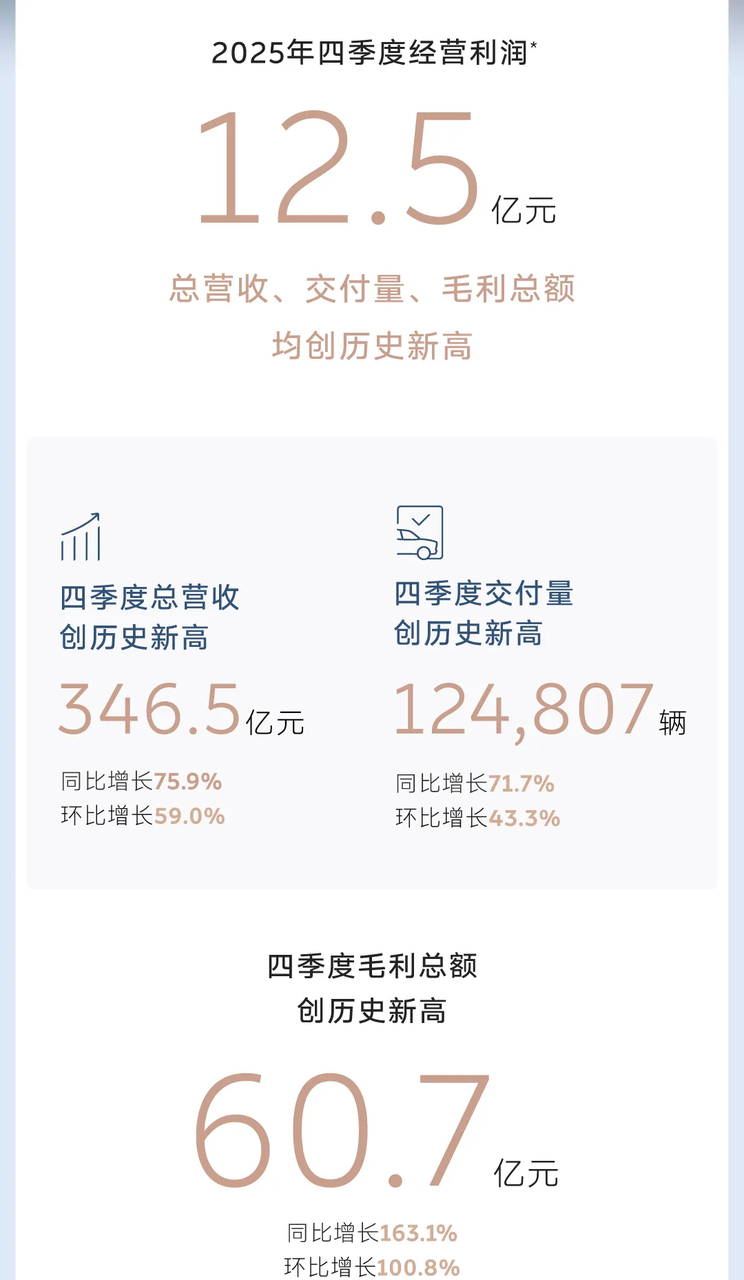 从最新财报来看,蔚来 2025 年第四季度经营利润达 12.5 亿元,总营收 346.5 亿元、交付量 124,807 辆、毛利总额 60.7 亿元,均创历史新高,分别同比增长 75.9%、71.7%、163.1%,这一系列亮眼成绩,进一步印证了换电模式与公司整体战略的可行性与成长性,多年来在换电、芯片、技术落地这些底层能力上的长期投入,终于开始阶段性兑现。