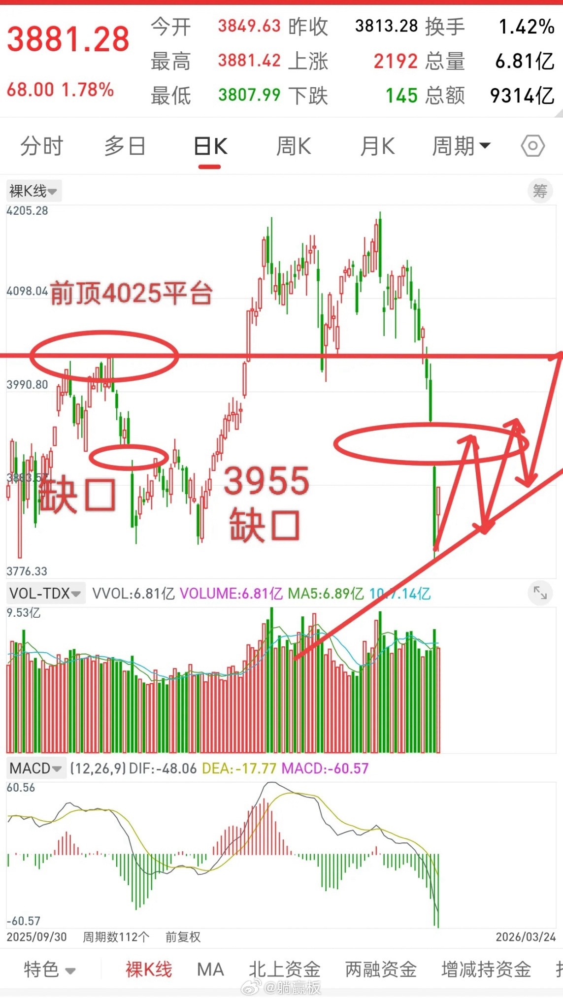 接下来几天就看回补缺口,补完之后,再看二次探底,然后再往上进攻4025前顶平台,形成一个大级别震荡上行的节奏。