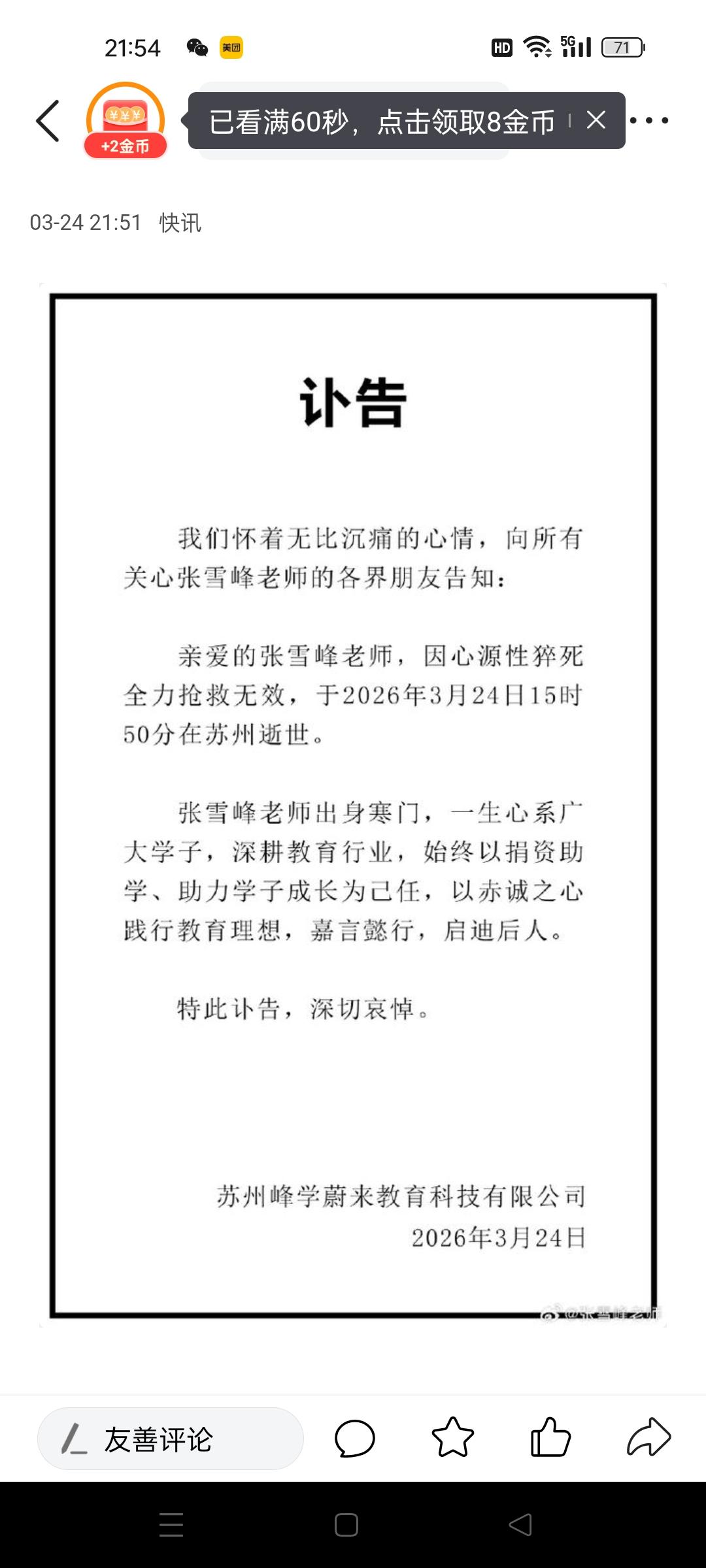 我刚去了大冰的直播间,弹幕都在说张雪峰老师去世了 大冰在直播间接到消息的时候,