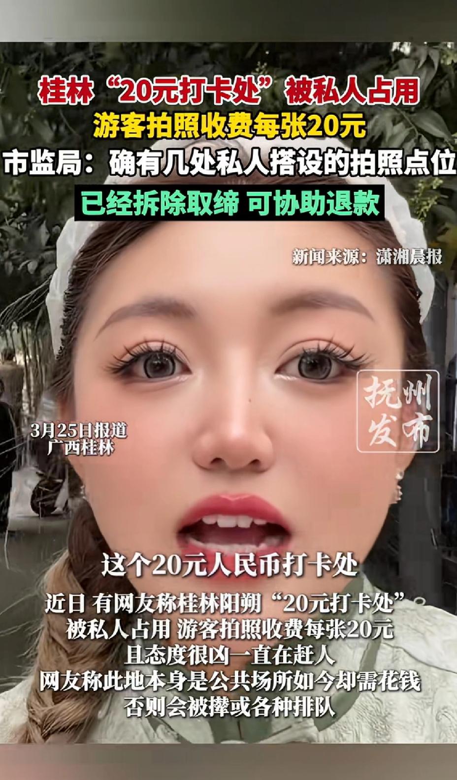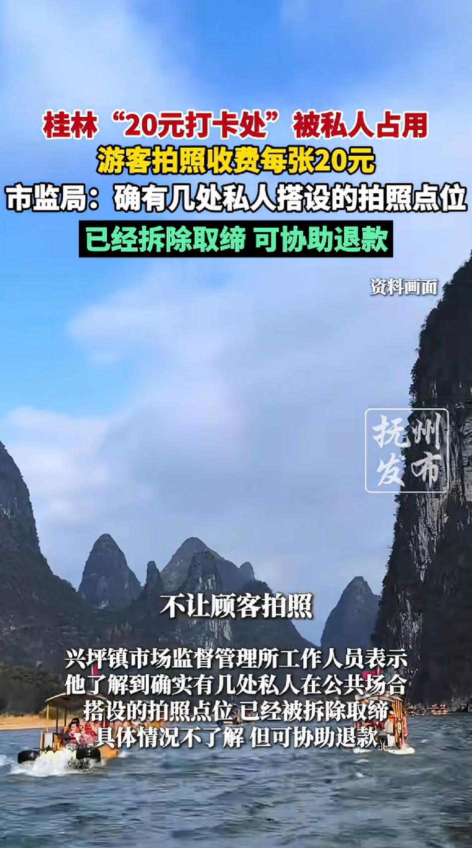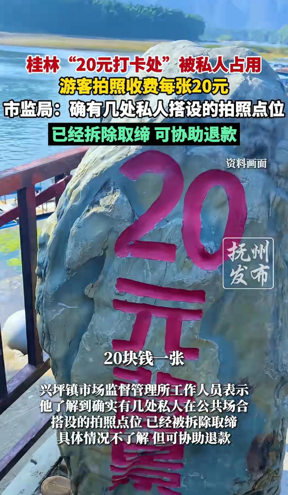 桂林“20元面值的打卡处”被私人占用,游客拍照收费每张20元, 市监局:确有几处私人搭设的拍照点位。已经拆除了,可协助退款。 20元人民币背面的黄布倒影,本是国人心中的山水浪漫,是无数游客去桂林的执念。可现在私人圈地,游客拍照一张收20元,还态度凶巴巴地赶人。 要知道这打卡处本是免费公共区域,景区是开放式的,沿江都能拍。一些村民私划区域收费,就是违规敛财。 其实沿着江岸走几步,就能找到免费又无遮挡的同款取景地。当地有关部门行动挺快,已拆除取缔了私人搭设的拍照点位,还能协助退款。希望以后别再出现这种破坏旅游体验的事了。
