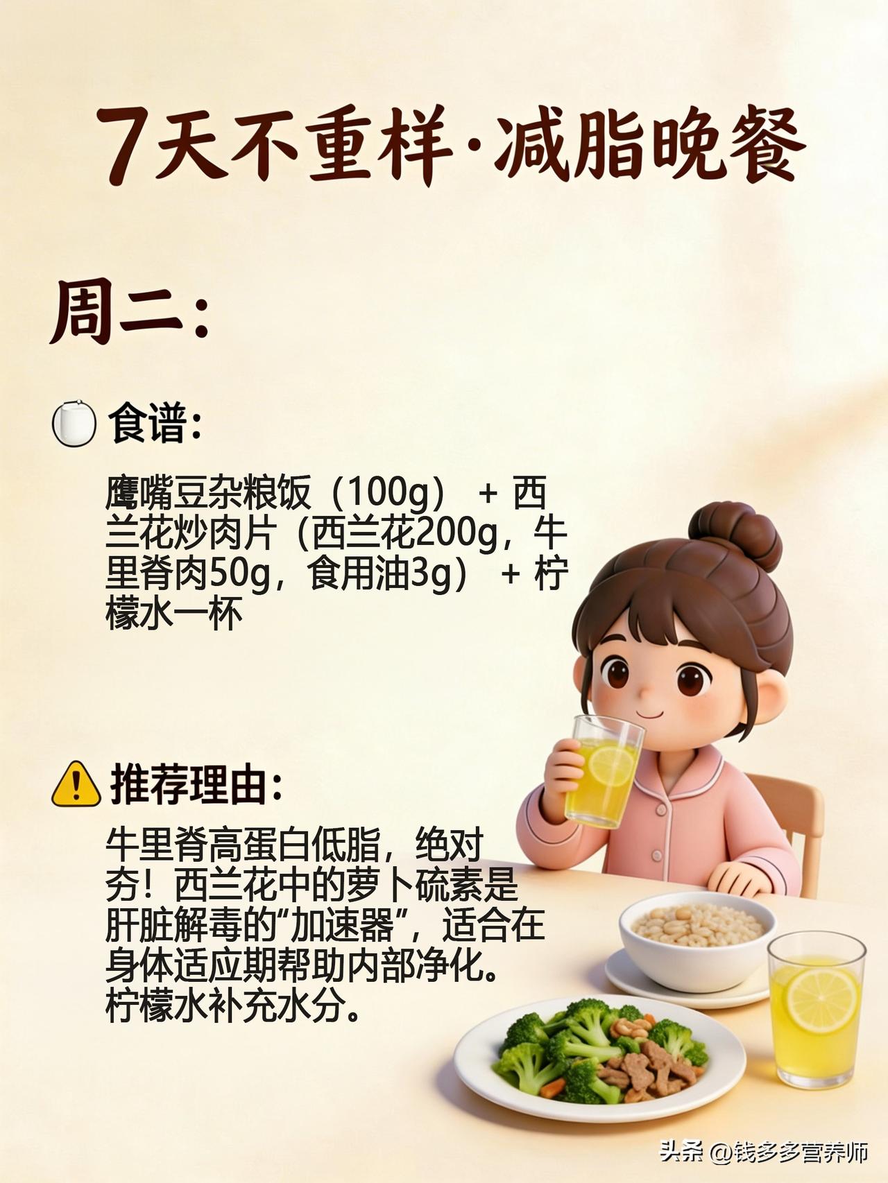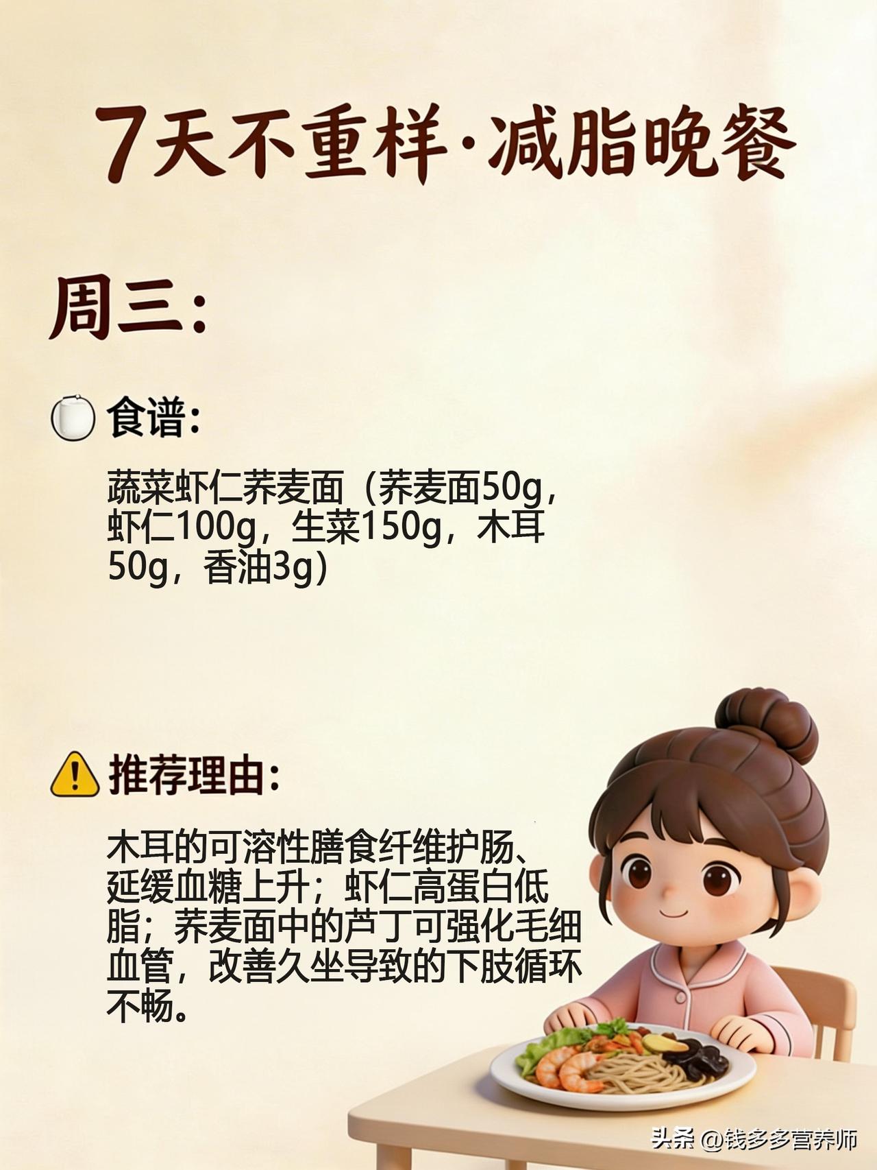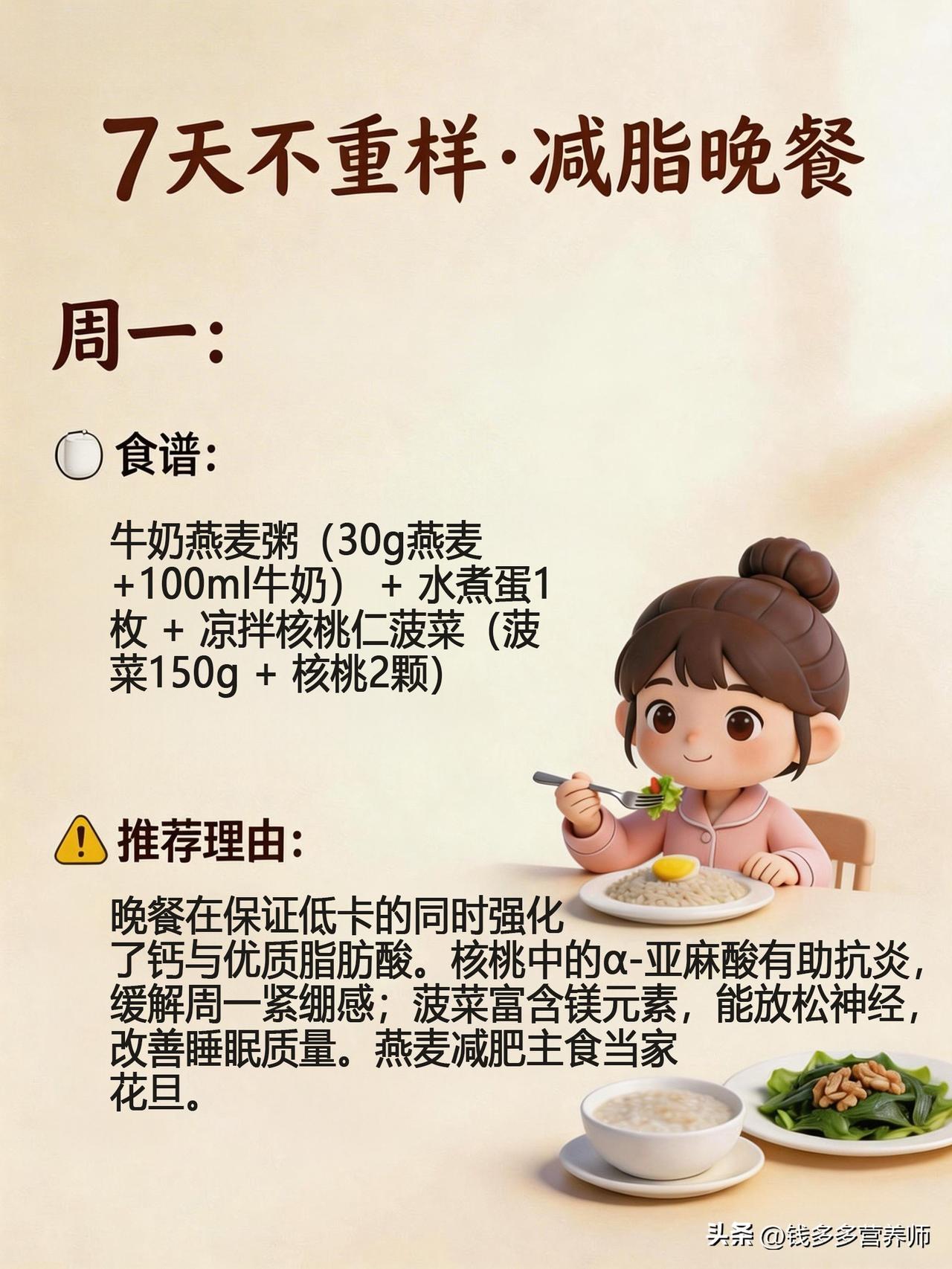 都重要,要相互配合!7分吃三分练! 营养师亲调|7天减脂晚餐食谱,每餐不到400大卡 减脂期晚餐怎么吃,直接影响第二天的体重数字。 吃多了长肉,吃少了饿醒,吃不对代谢掉得更快。很多人的减脂晚餐其实都踩了坑——要么碳水太高,要么蛋白质不足,要么膳食纤维不够。 这套7天不重样减脂晚餐,每餐热量严格控制在400大卡以内,同时兼顾了三大营养素的合理配比和微量元素的补充。 具体怎么吃? 所有食材、用量、烹饪方式,以及每餐的营养师推荐理由,都整理在下方图片里了。建议截图保存,方便买菜时对照。 还有3点补充提醒: 1. 进食顺序建议:先喝汤/水,再吃蔬菜,然后吃蛋白质,最后吃主食。这个顺序能有效平缓餐后血糖。 2. 食用油建议轮换使用,不必固定一种。 3. 晚餐时间尽量在睡前3小时完成,给肠胃留出消化时间。 减脂不是饿出来的,是吃出来的。这套食谱照着吃,一周就能看到变化。记得按照图片里的食谱吃起来~