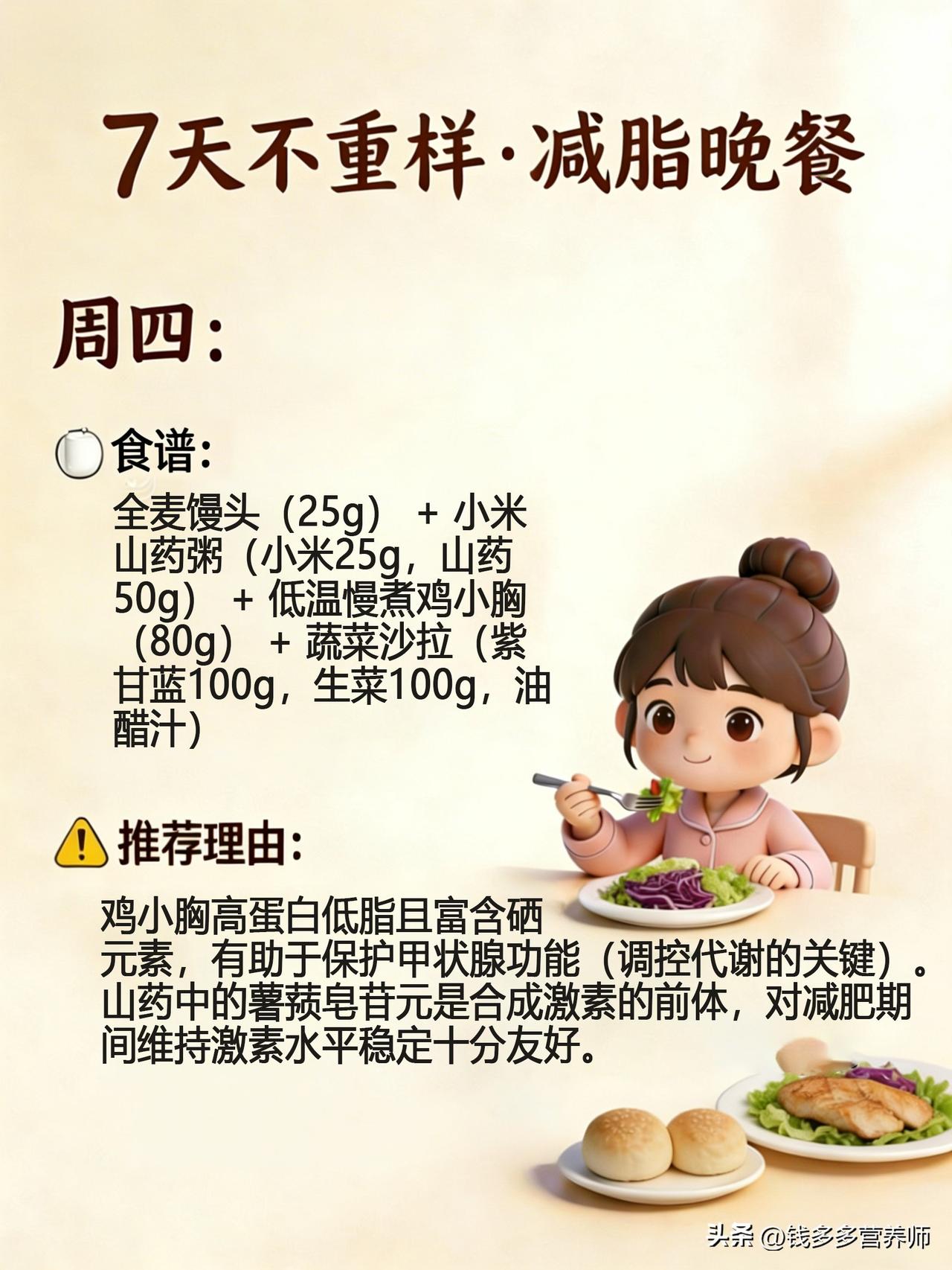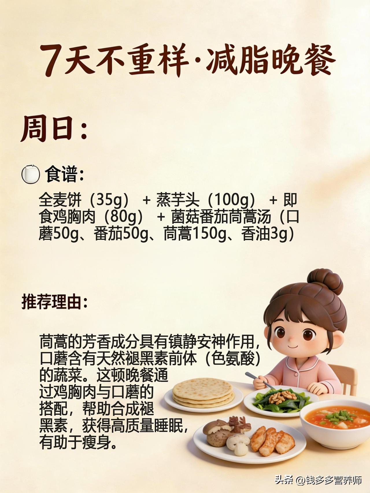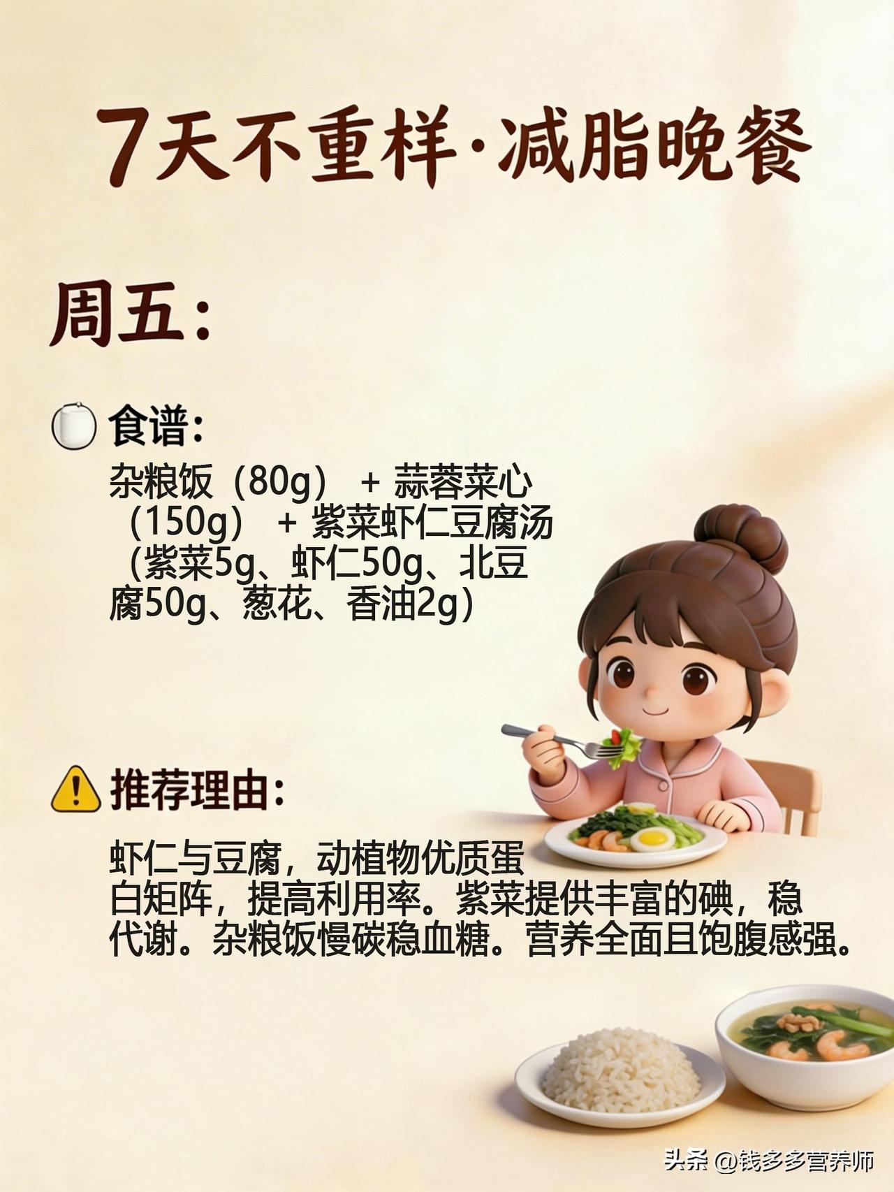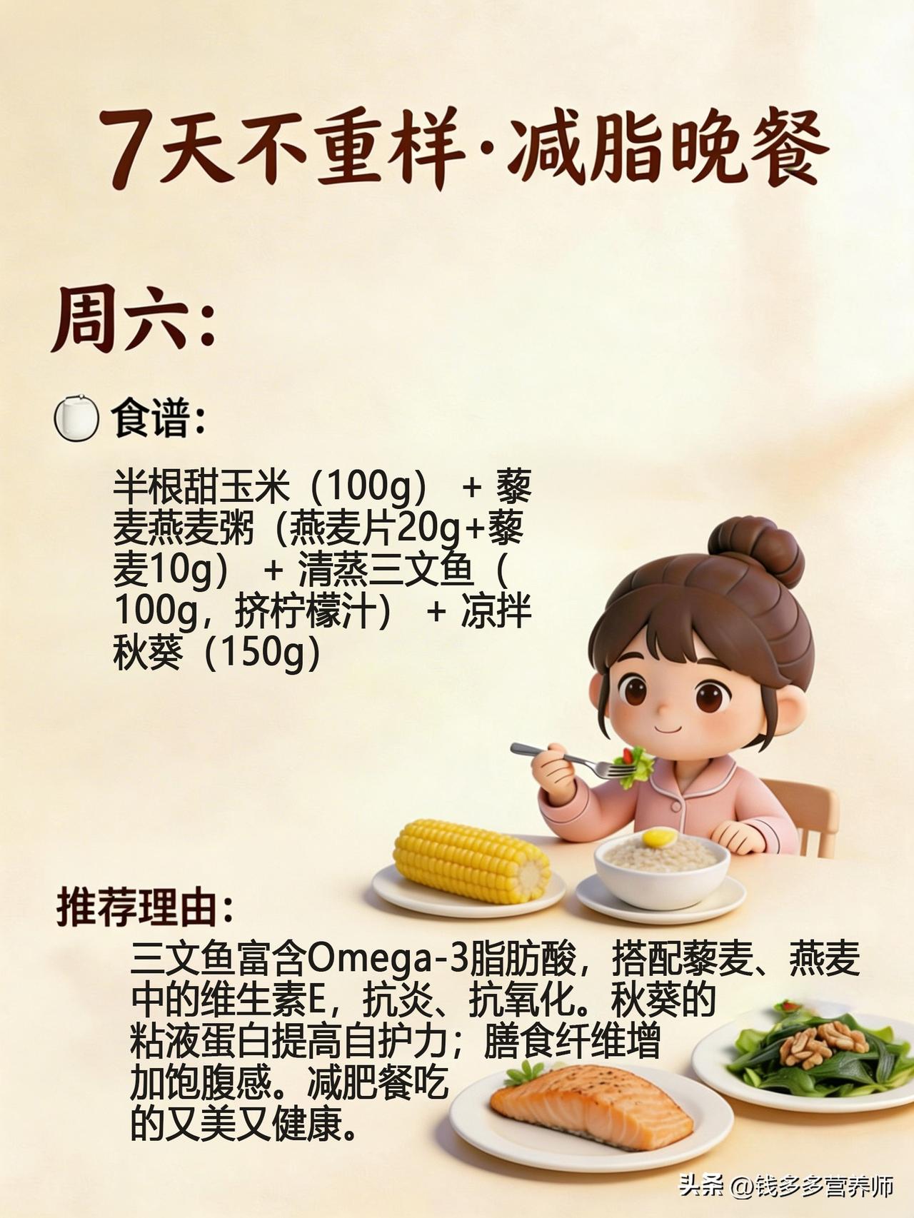 都重要,要相互配合!7分吃三分练! 营养师亲调|7天减脂晚餐食谱,每餐不到400大卡 减脂期晚餐怎么吃,直接影响第二天的体重数字。 吃多了长肉,吃少了饿醒,吃不对代谢掉得更快。很多人的减脂晚餐其实都踩了坑——要么碳水太高,要么蛋白质不足,要么膳食纤维不够。 这套7天不重样减脂晚餐,每餐热量严格控制在400大卡以内,同时兼顾了三大营养素的合理配比和微量元素的补充。 具体怎么吃? 所有食材、用量、烹饪方式,以及每餐的营养师推荐理由,都整理在下方图片里了。建议截图保存,方便买菜时对照。 还有3点补充提醒: 1. 进食顺序建议:先喝汤/水,再吃蔬菜,然后吃蛋白质,最后吃主食。这个顺序能有效平缓餐后血糖。 2. 食用油建议轮换使用,不必固定一种。 3. 晚餐时间尽量在睡前3小时完成,给肠胃留出消化时间。 减脂不是饿出来的,是吃出来的。这套食谱照着吃,一周就能看到变化。记得按照图片里的食谱吃起来~