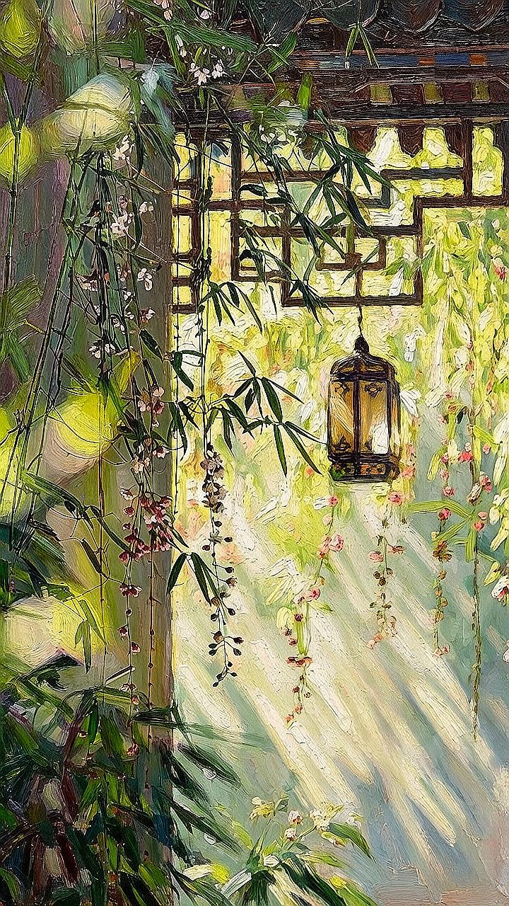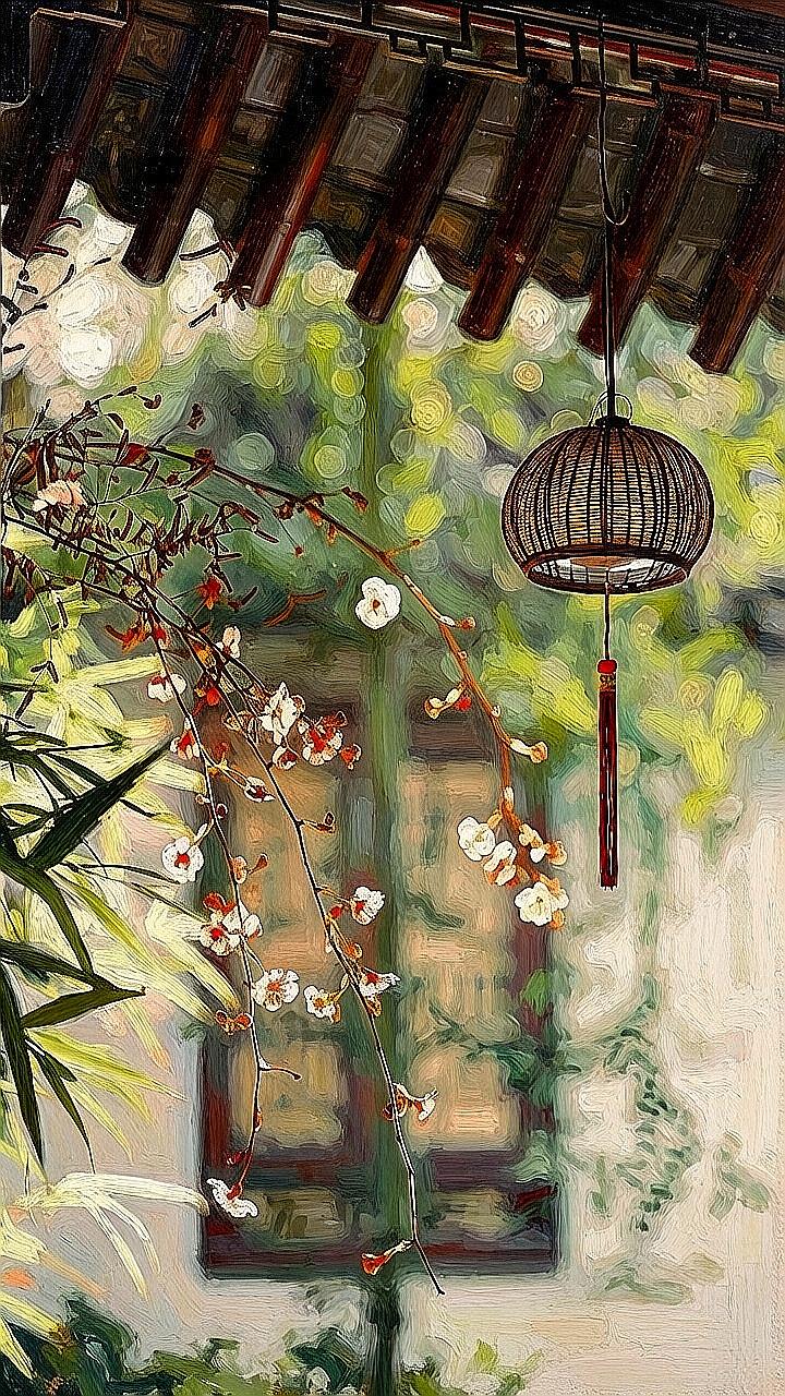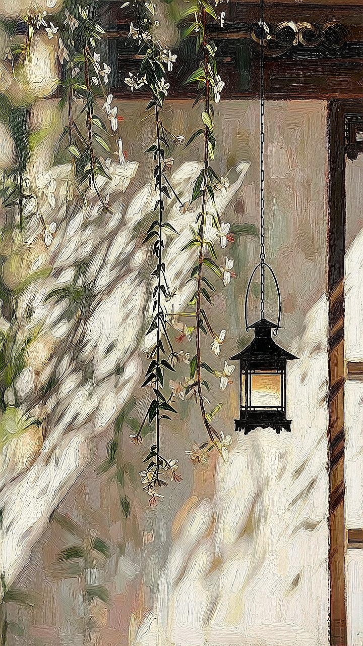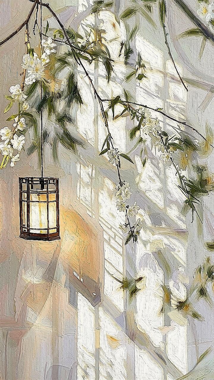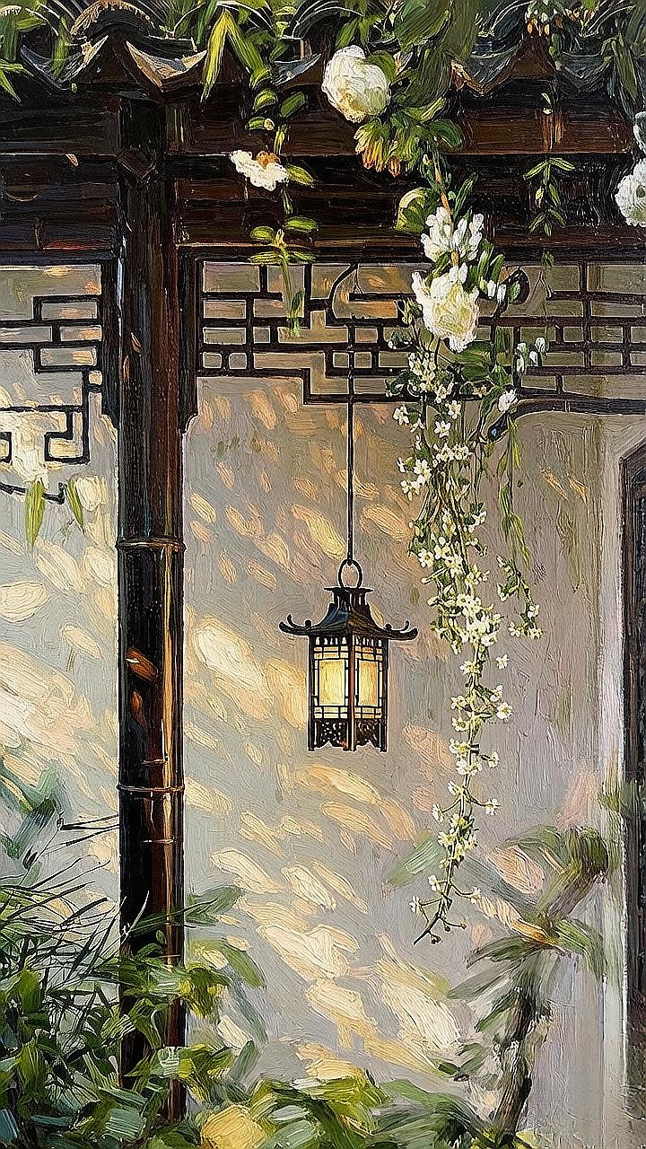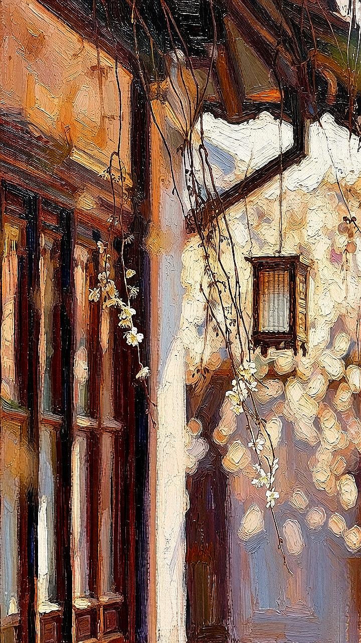 枝头花影摇,墙角灯如诗,谁在巷口等你归?古风油画 江南小巷 光影艺术 治愈系风景