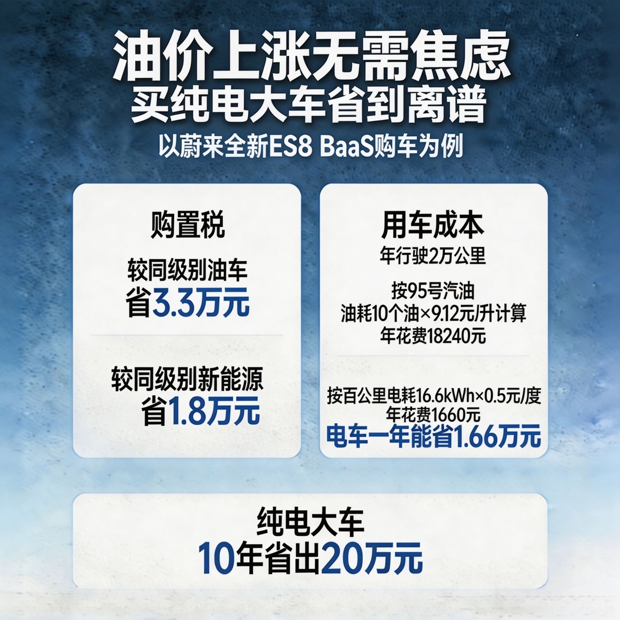 油价持续上涨,油车每月油费压力剧增。以全新 ES8 BaaS 购车为例:年行驶 2 万公里,油车年花费 18240 元,电车仅 1660 元,10 年能比同级油车省出 20 万,搭配 BaaS 方案省购置税,对比同级车型更可省 1.8-3.3 万元。电池终身无忧,轻松实现油车转电。