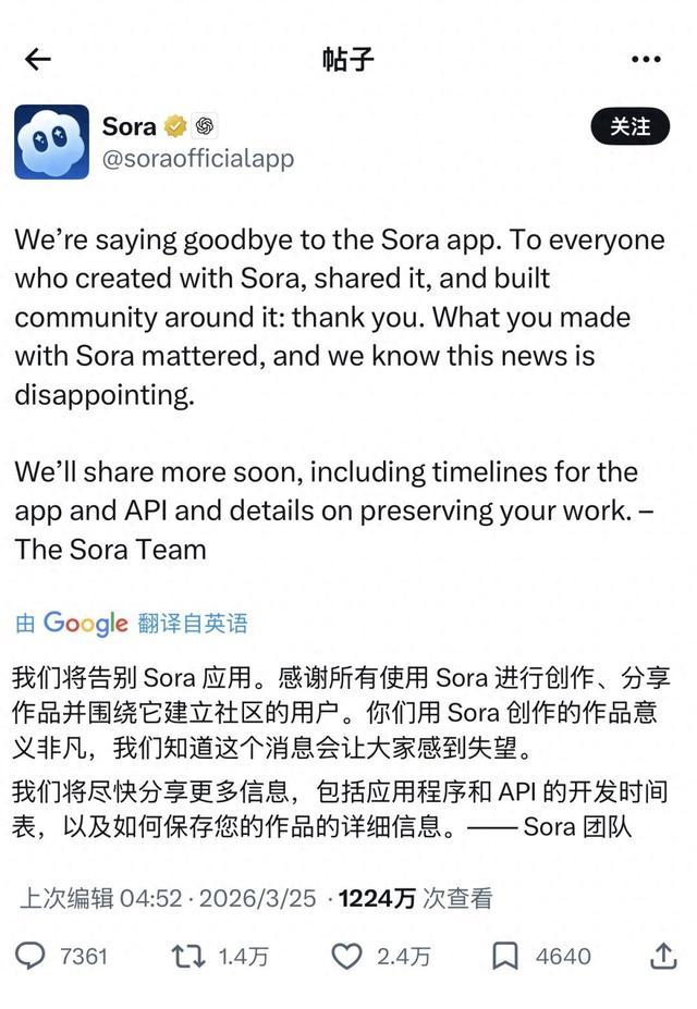 3月25日,曾经红极一时的Sora,其团队在社交媒体上发布消息称,SoraApp(应用)将要告别。其团队说,“我们将告别Sora应用。感谢所有使用Sora进行创作、分享作品并围绕它建立社区的用户。你们用Sora创作的作品意义非凡,我们知道这个消息会让大家感到失望。”同时,团队表示,将尽快分享更多信息,包括应用程序和API的开发时间表,以及如何保存用户作品的详细信息。