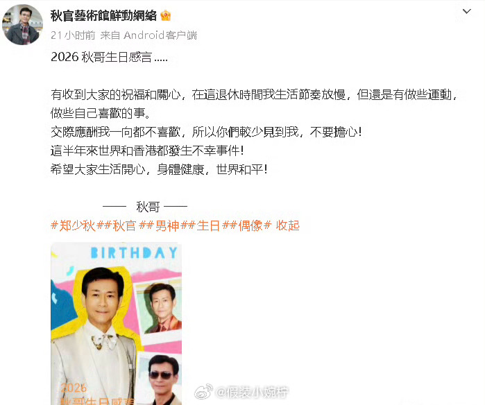 79岁郑少秋官宣退休他是荧幕上的楚留香、乾隆、张无忌、丁蟹,60年演艺生涯,塑造无数经典。如今大侠归隐,江湖再无秋官身影。