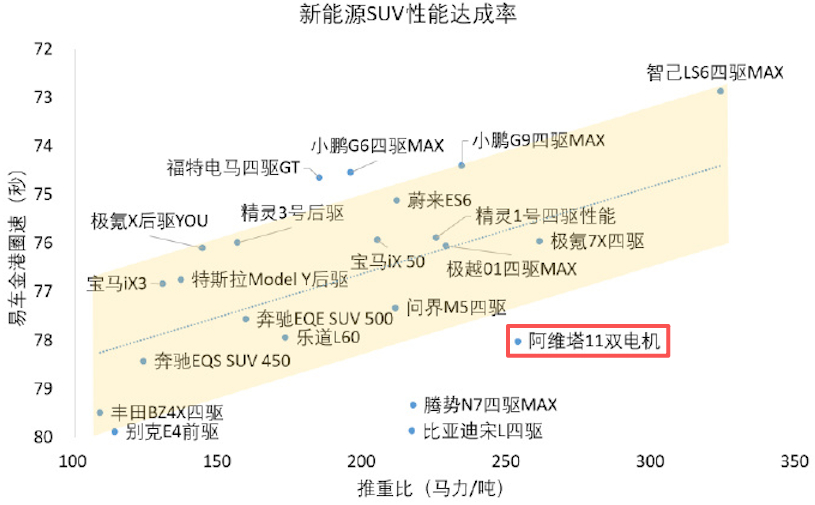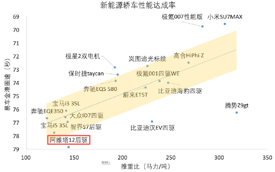 但话说回来,阿维塔并不是一个以运动性能见长的品牌,之前在我计算的性能达成率,阿维塔仅险胜比亚迪双雄,显著低于平均水平,一看就不是跑赛道的料。