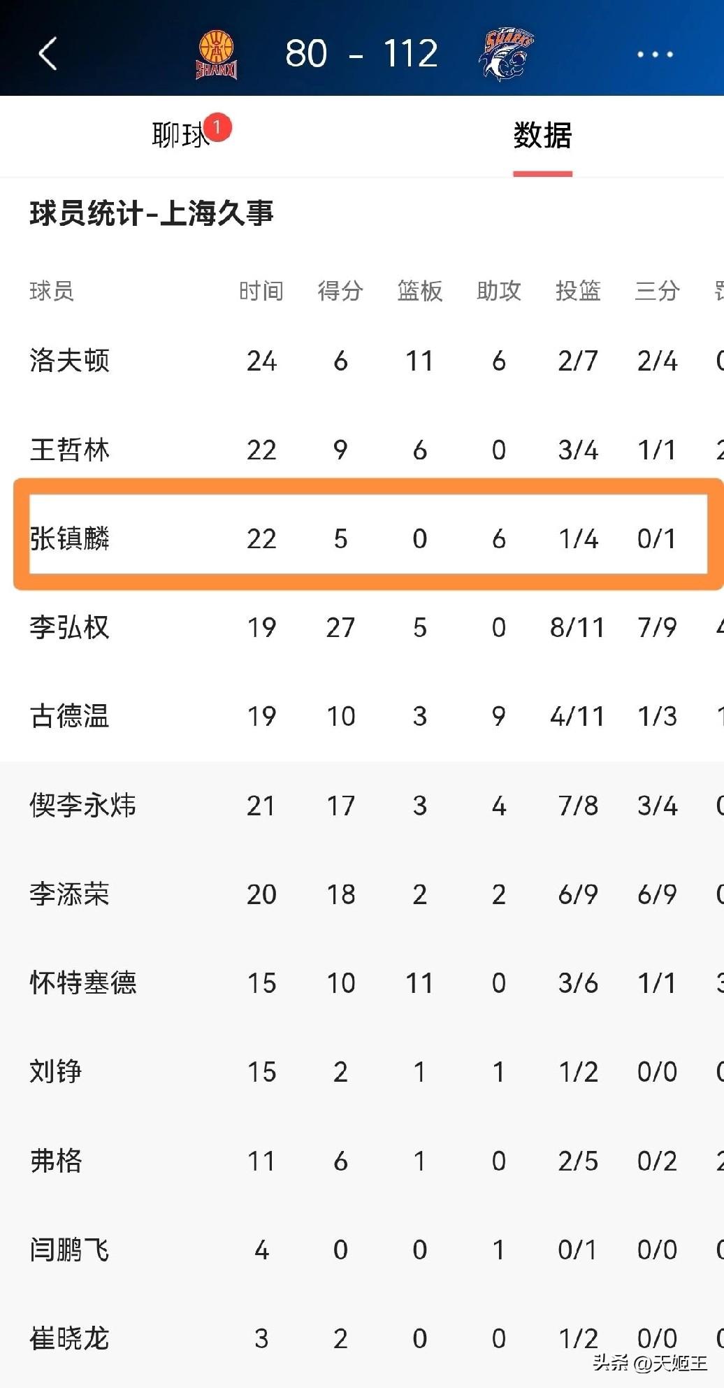 上海大胜山西!全队开花,唯独张镇麟有点“隐身” 上海久事客场112-80轻松拿下山西汾酒,大胜32分相当痛快。 不过首发登场的张镇麟,这场表现确实有点平淡。出战22分钟,4投1中,三分球1中0,罚球4中3,只拿到5分,是首发里得分最低的一位。 虽然正负值+12,球队赢球他也在场上,但整体进攻存在感不高,突破、投篮都没打开,完全没打出大家期待的球星级别表现。 希望下场能找回状态,真正扛起上海锋线!上海篮球外援 上海nba球员 全运会上海男篮 杨曦麟 全运上海队 常晋篮球 张传麟 全远会男篮