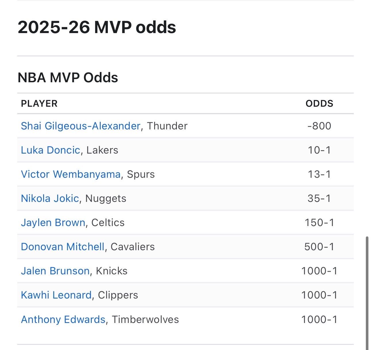 NBA本赛季冠军和MVP赔率夺冠赔率前三:雷霆、绿军、马刺MVP赔率前三:SGA、东契奇、文班NBA